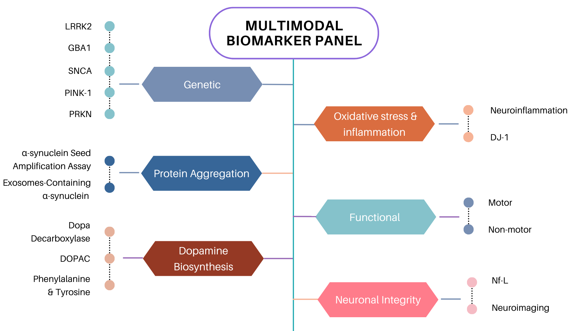 Objective: To explore the potential of a multidimensional biomarker panel integrating motor, non-motor, biochemical, metabolic, genetic, and neuroimaging biomarkers to increase sensitivity and specificity of early detection, disease stratification, and improved therapeutic strategies in Parkinson’s disease (PD).
