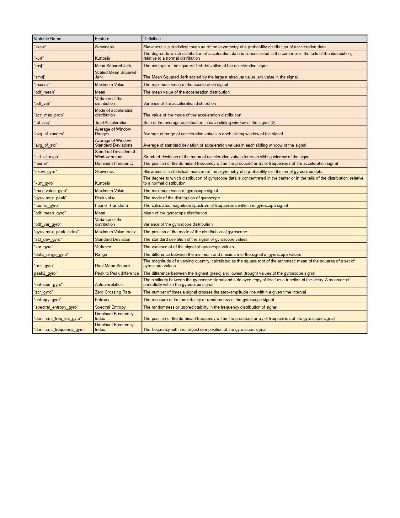 Method: PwPD (n = 32) and healthy controls (HC) (n = 2) capable of performing ADLs were enrolled in the study. IMUs were calibrated and mounted to a plastic toothbrush and hair comb to track motion during ADL performance. Study participants were first asked to brush their teeth and comb their hair for an unspecified length of time. Patients were then instructed to repeat 2-3 additional one-minute trials, depending on the length of their first trial. Motion capture data and a video recording were collected for all trials. Patient UPDRS subscores were recorded and summed to one total score [1]. Signals under 30s long and those with sensor artifacts were removed. Accelerometer and gyroscope data were isolated from the IMU, preprocessed, and analyzed to extract 30 signal features [table1]. Features were used for a classification task to differentiate among HC (UPDRS 0), mild severity PD (UPDRS 0-32), and moderate severity PD (UPDRS 33-59). Signals were split into 7-second, non-overlapping intervals, and used to train a decision tree model.