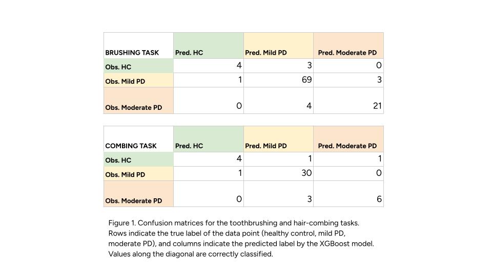 Results: The model trained on toothbrushing data achieved F1-scores of 0.67, 0.93, and 0.86 for HCs, mild severity PD, and moderate severity PD, respectively, and an accuracy of 89.52% on a held-out test set (20% of total data). Decision tree models trained with 10-fold cross-validation achieved an average accuracy of 87.38% ± 3.85%. The model trained on combing data achieved F1-scores of 0.73, 0.92, and 0.75 respectively, and an accuracy of 86.96% on the test set. Average diagnostic accuracy was 85.82% ± 5.34% when trained with 10-fold cross-validation. Confusion matrices for both tasks are shown [figure1].