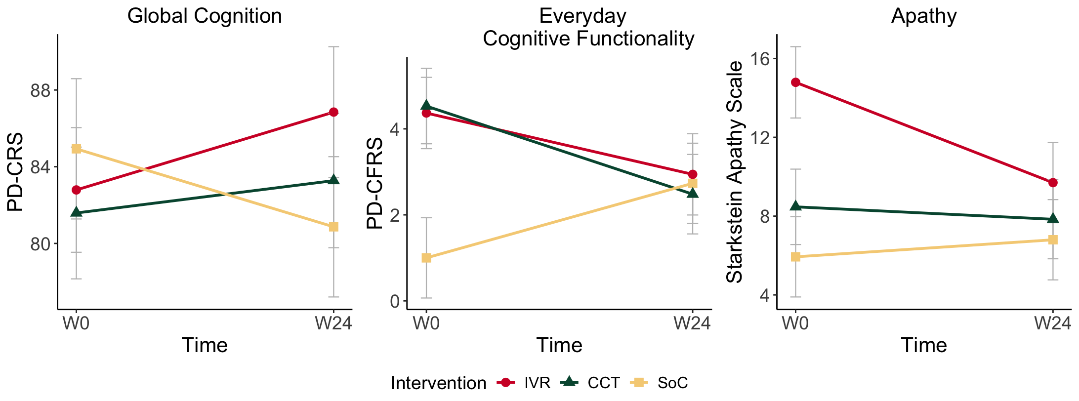 Method: We conducted a 24-week, single-center, randomized, single-blind clinical trial in people with PD-MCI. Participants were randomized into an executive function-focused IVR intervention (n = 19) or a multidomain CCT intervention (n = 17). A standard of care (SoC; n = 15) control group with no active intervention was also involved. Weekly 45-min sessions were conducted. Baseline and post-intervention assessments included measures of global cognition, functional, motor, neuropsychiatric symptoms, and digital metrics derived from the interventions, along with structural and functional neuroimaging