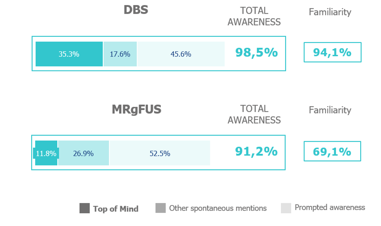 Results: 68 MDN completed the survey. While 94.1% were familiar with DBS, only 69.1% were familiar with MRgFUS (Figure 1).