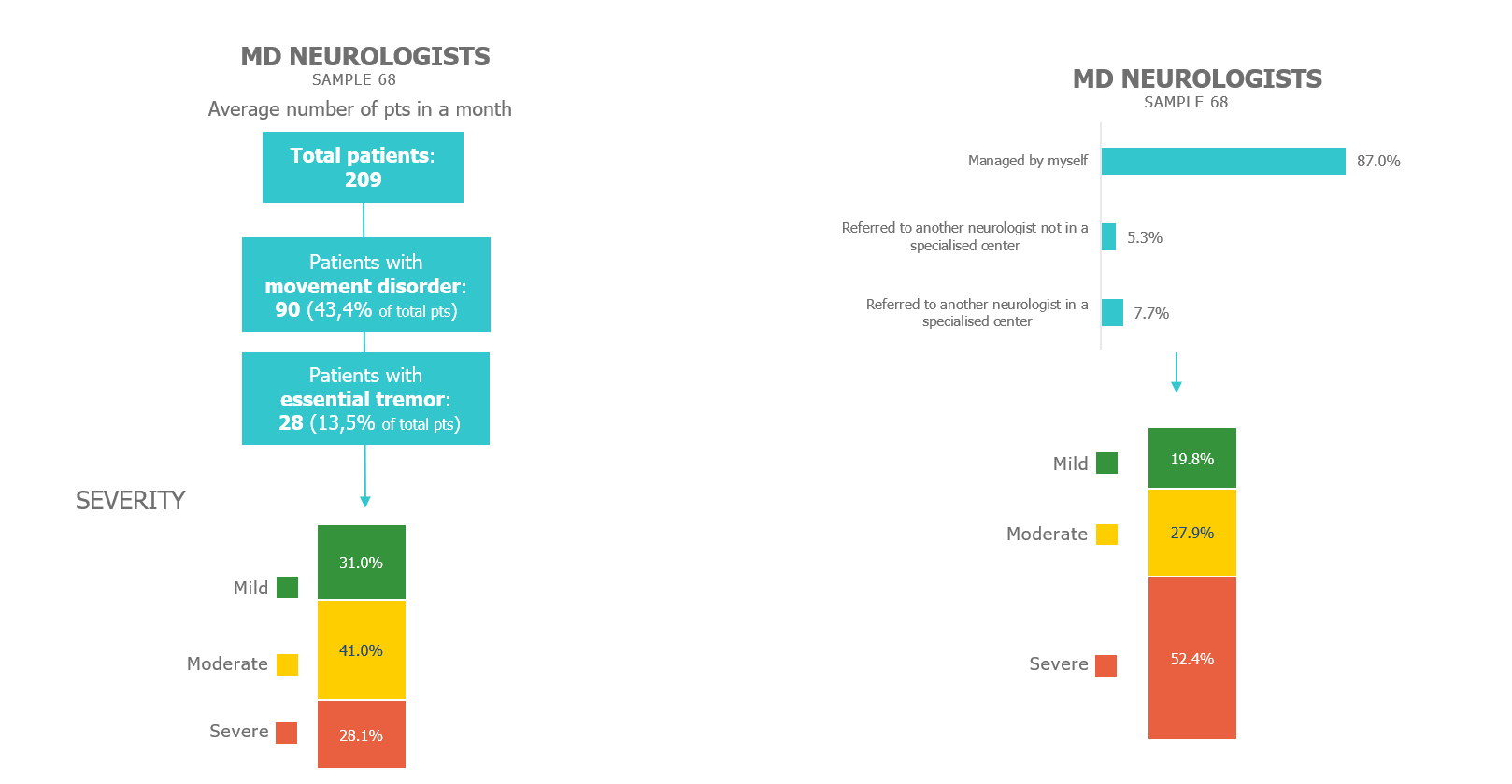 MDN reported that 13.5% of their patients suffered from ET. 69.1% of those presented a moderate to severe condition. Most were managed directly by them, without referral to another neurologist or centre (13%); when the patient was referred to another centre, disease was in most cases severe (52.4%) (Figure 2).