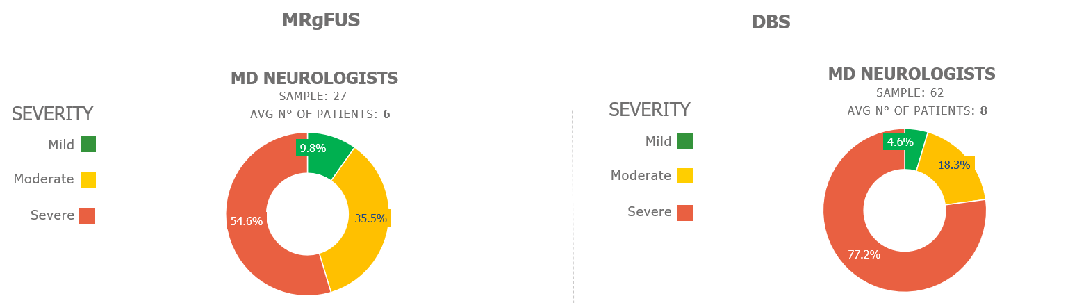 When prescribed, earlier referral of MRgFUS vs DBS was observed: DBS (Mild 4.6%; Moderate 18.3%; Severe 77.2%) MRgFUS (Mild 9.8%; Moderate 35.5%; Severe 54.6%) (Figure 3).