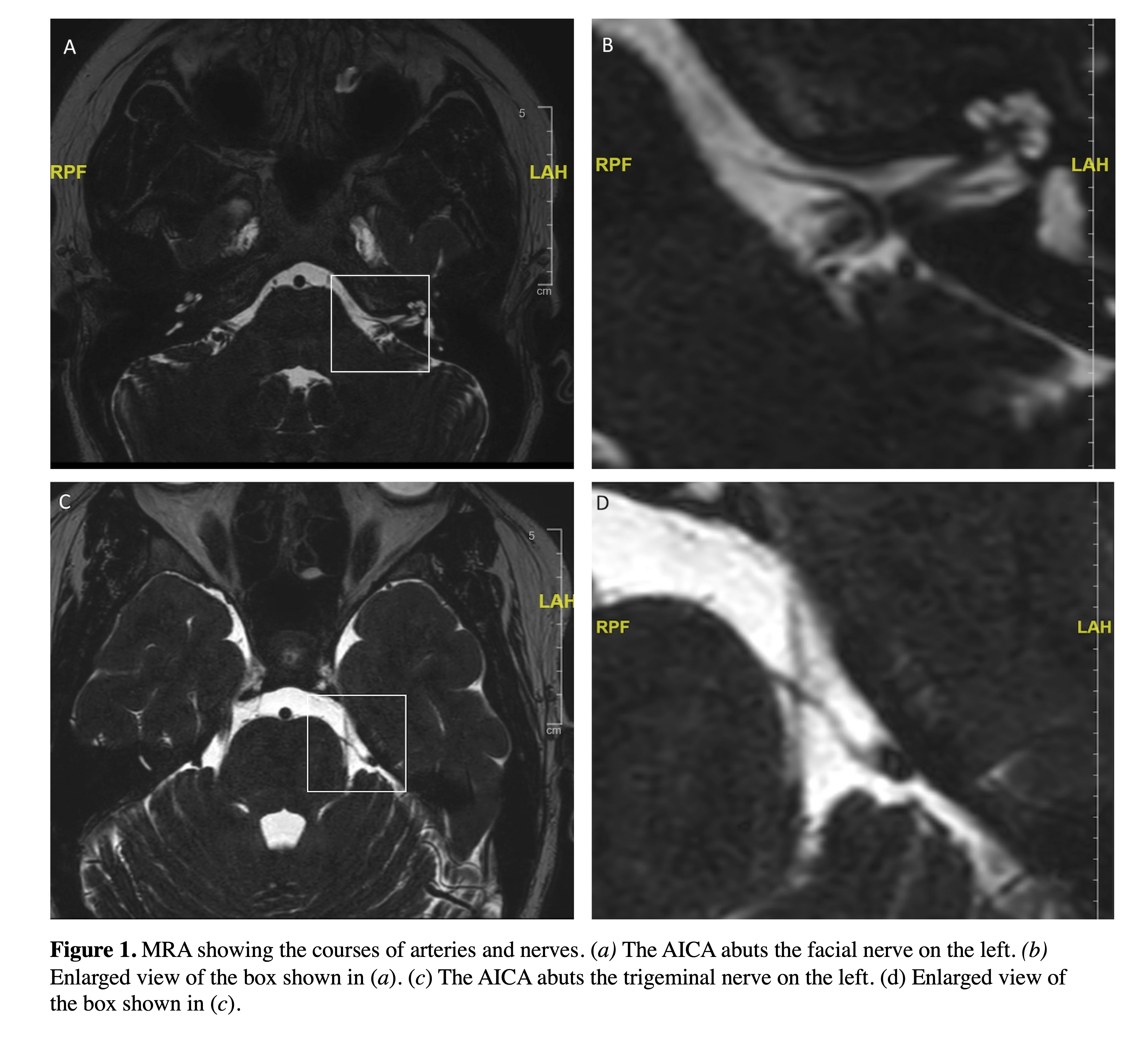 Conclusion: This is the first case of facial nerve compression causing both activity and position-dependent HFS. Some prior cases describe position-dependent HFS but none associated with activity. In this case, the unique presentation of both position and activity dependent HFS was caused by the AICA looping over the facial nerve on the left, which is similar to the cause of HFS in other cases. The AICA also abuts the trigeminal nerve, likely causing the patient’s numbness and shooting pain. The HFS on the right was not position dependent, though it was caused by similar compression of the facial nerve by the AICA.