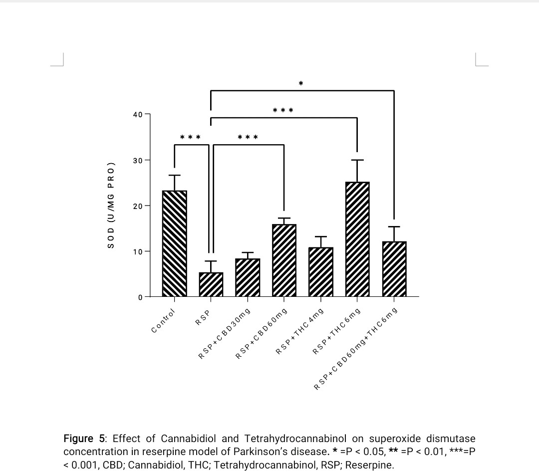 Conclusion: Based on this current study, it can be finalized that Cannabidiol treatment significantly increased Thermal and Mechanical pain threshold. It also significantly decreased MDA concentration and significantly increased SOD in reserpine induced model of Parkinson’s disease. THC on the other hand has successfully increased significantly cold pain threshold and mechanical nociceptive threshold. THC also decreased significantly the level of MDA concentration and increased significantly SOD and GSH level. Co-administration of CBD and THC increased significantly SOD and GSH level and decreased significantly the level of MDA concentration.