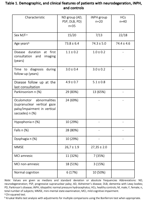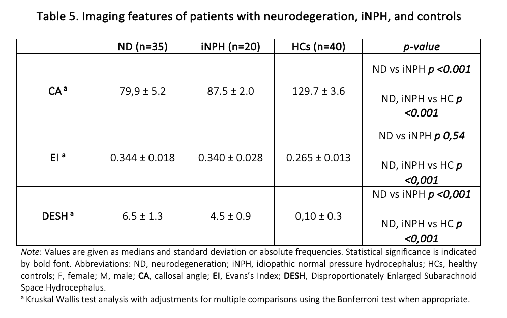 Method: A retrospective study analyzed 55 patients with gait impairment and 40 matched sex/age healthy controls (HCs). Brain MRIs assessed ventriculomegaly using EI>0.3 and CA<90º, alongside DESH. Patients were classified into neurodegeneration (PSP, AD, DLB, PD), iNPH, and HCs based on diagnostic criteria, cognitive tests, CSF biomarkers, and ¹⁸F-Dopa-PET during follow-up. Kruskal-Wallis and Bonferroni tests were used for analysis