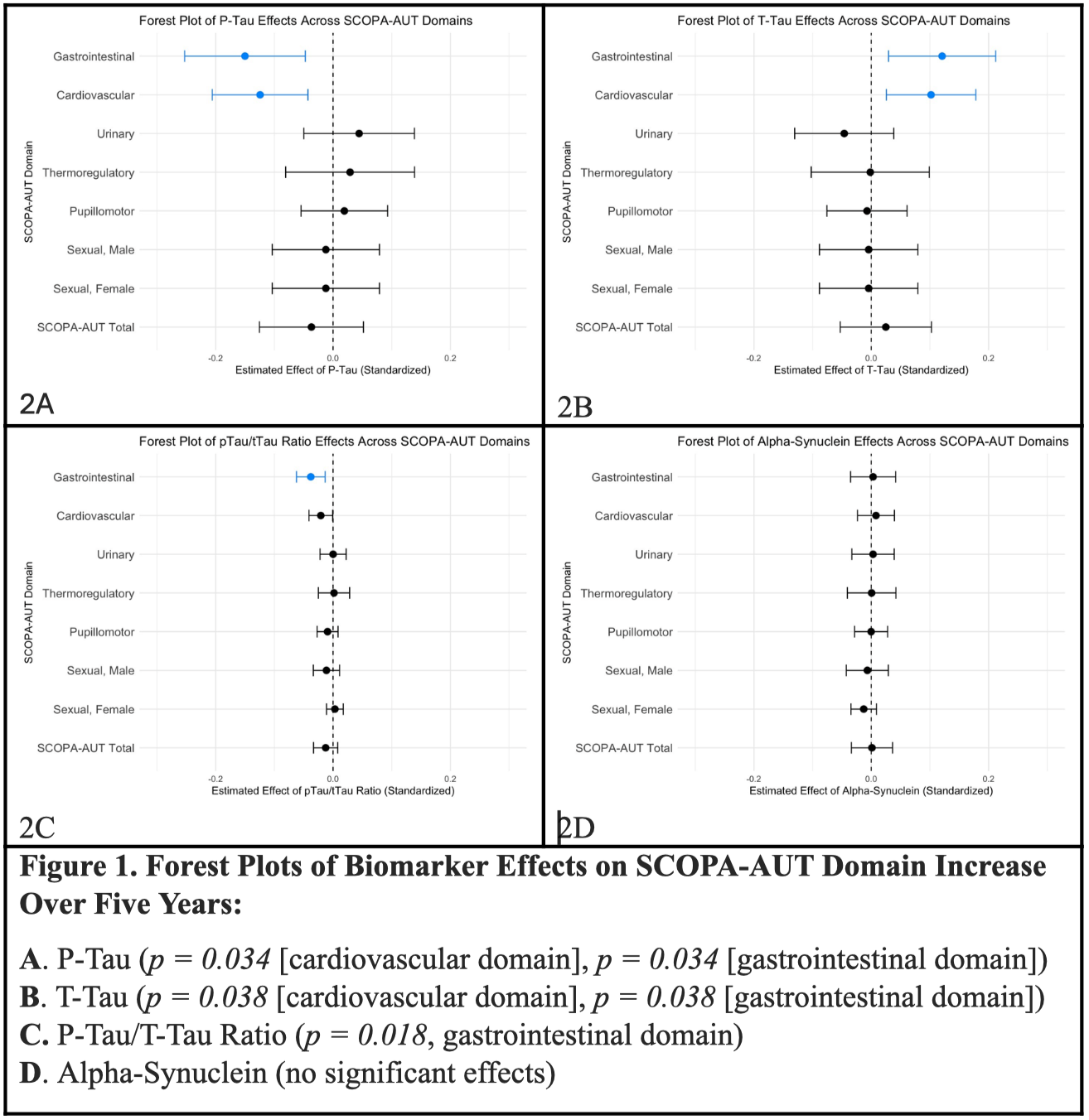Results: P-tau (p = 0.034) and t-tau (p = 0.038), were associated with cardiovascular domain SCOPA-AUT score increase over five years. A correlation was also found between p-tau (p = 0.034), t-tau (p = 0.038), and a pTau/tTau ratio (p = 0.0184) with the gastrointestinal domain. No significant association was observed between α-syn concentrations and SCOPA-AUT score progression.