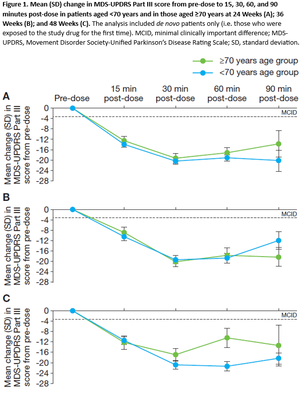 Objective: This study evaluated the efficacy of apomorphine sublingual film (SL-APO) in elderly (≥70 years) and younger (<70 years) patients over the long term.