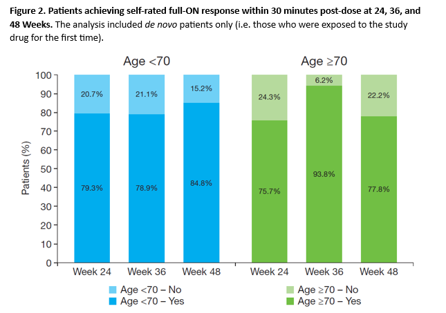 Results: Of the 369 de novo (not previously exposed to SL-APO) patients included in Study CTH-301, 253 (68.6%) were aged <70 years and 116 (31.4%) ≥70 years. The mean SL-APO optimised dose was similar for the <70 and the ≥70 years age groups (19.6 mg vs 21.2 mg; p=0.09). Both groups achieved a clinically meaningful reduction in MDS-UPDRS Part III at all time points [figure1]. More than 75% of patients in both groups reported a full-ON response at all visits [figure2]. The rate of discontinuation due to lack of efficacy was low and comparable across age groups (6.3% [16/253] vs 6.0% [7/116]).