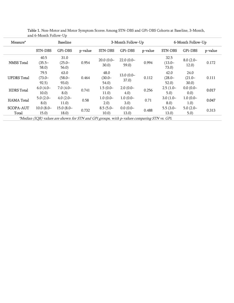 Results: Of 51 initially enrolled PD patients, 33 completed all required assessments (GPi: n=20; STN: n=13) (Table 1). All patients showed a reduction in baseline scores at 6 months. At this timepoint, STN-DBS patients exhibited a trend toward higher NMSS (median: 32.5 vs 8.0) and UPDRS total scores (median: 42.0 vs 24.0) compared with GPi-DBS, suggesting a greater symptom burden. STN-DBS was also associated with significantly higher depression (HDRS median: 2.5 vs 0.0, p=0.017) and anxiety scores (HAMA median: 3.0 vs 1.0, p=0.047) than GPi-DBS. No significant differences were observed in PDQ-39 scores (median: STN-DBS 17.5 vs GPi-DBS 8.0). Additionally, a trend toward improved autonomic dysfunction (SCOPA-AUT, median: STN-DBS 5.5 vs GPi-DBS 5.0) was noted in the STN-DBS group.