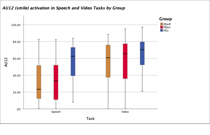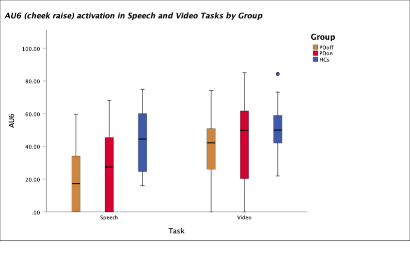 Method: 30 HCs (25M, 5F) and PD subjects (off/on medication) (26M, 4F) completed a video watching task (watching an amusing clip) and a speaking task (talking about the clip). Footage was analysed using Affdex AFEA. AFEA provided a score (%) pertaining to activation of Cheek raise (AU6)  and Smile (AU12)  which together are considered to form a genuine Duchenne smile and expression of ‘felt’ happiness [4].