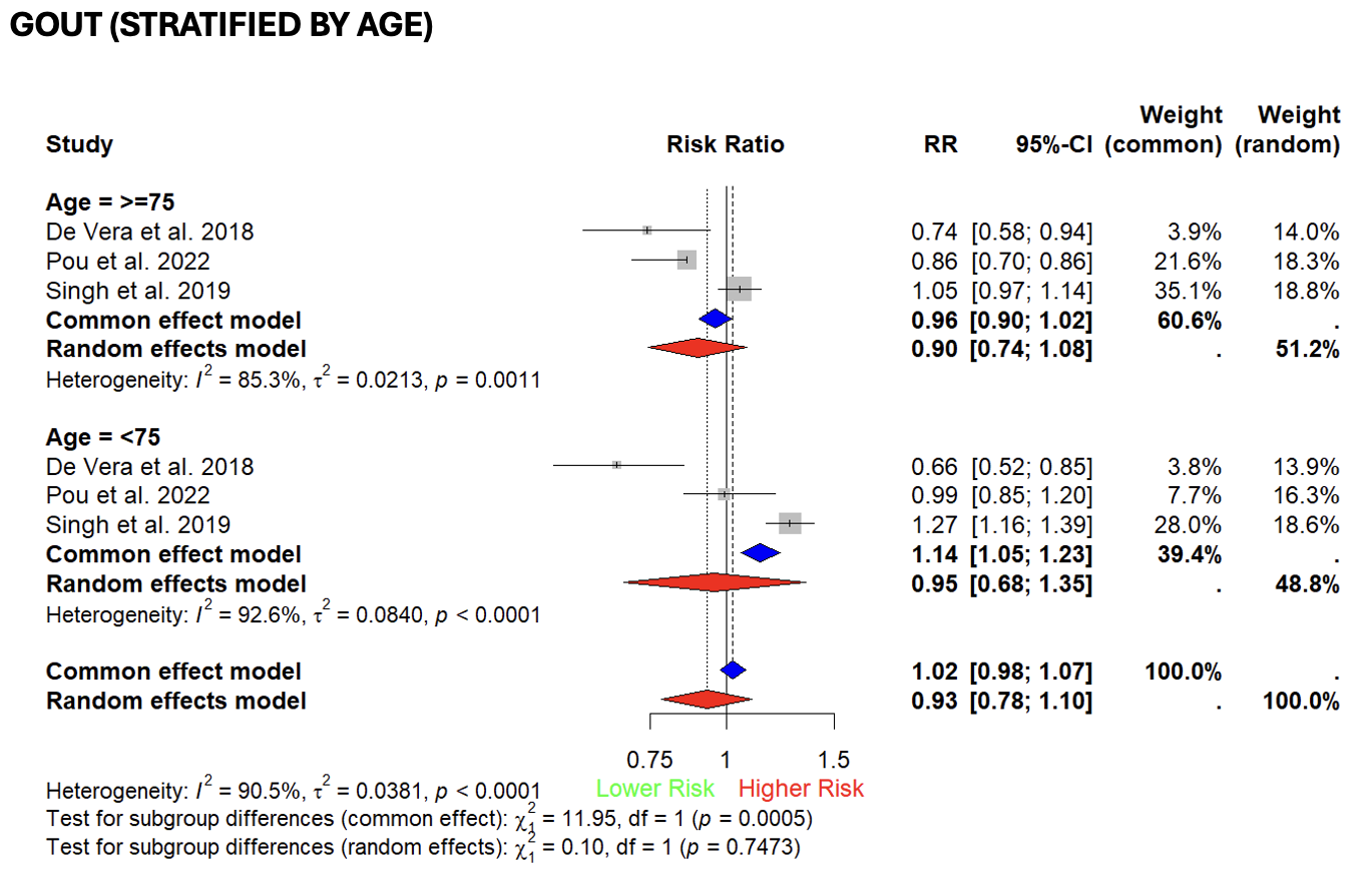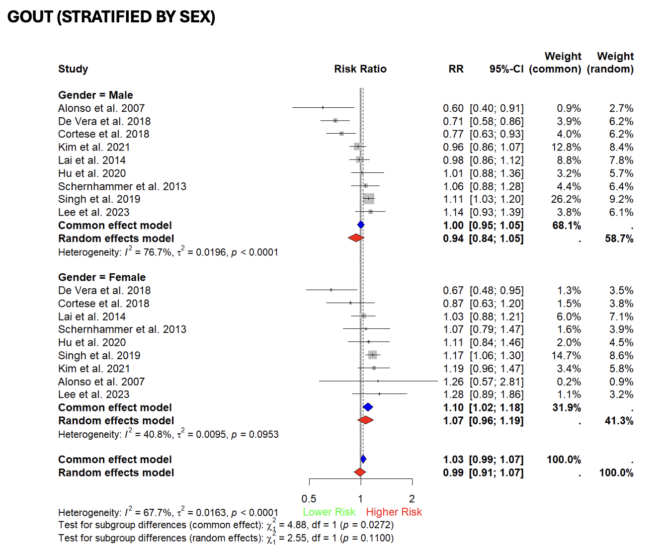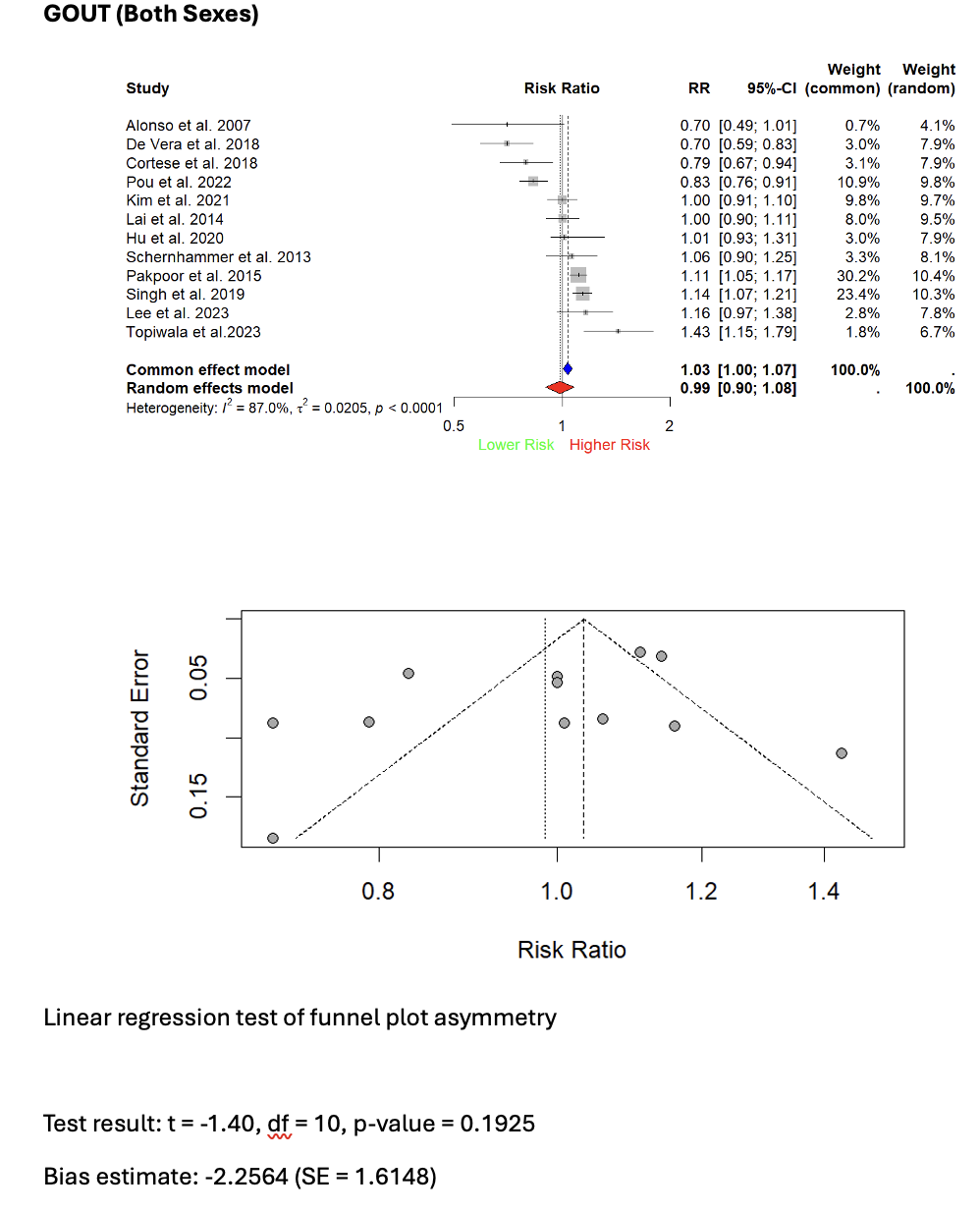 Results: Twelve studies met the inclusion criteria. Meta-analysis showed no significant association between gout and PD (RR: 0.99 [0.90, 1.08], I² = 87%), but hyperuricemia was associated with a reduced PD risk (RR: 0.69 [0.56, 0.85], I² = 73.4%). In gender-stratified analysis, gout showed no significant association with PD in males (RR: 0.94 [0.84, 1.05]) or females (RR: 1.07 [0.96, 1.19]), whereas hyperuricemia was more protective in males (RR: 0.48 [0.24, 0.97]) than in females (RR: 0.84 [0.44, 1.61]). Age-based analysis indicated that both hyperuricemia and gout were associated with lower PD risk in individuals <75 years, but no significant protective effect was observed in those ≥75 years.