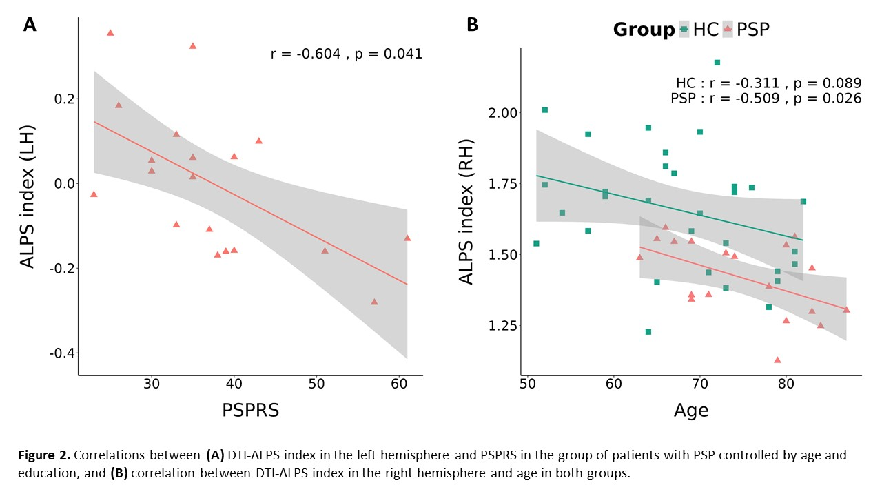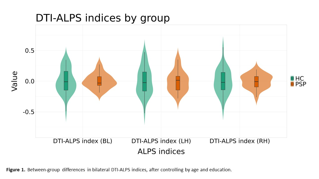 Background: PSP is an atypical parkinsonian syndrome classified as a 4-repeat-tauopathy [1]. The DTI-ALPS indices have been proposed as a non-invasive local proxy of the glymphatic system activity [2], which is well-known as a waste drainage system of interstitial solutes like tau neurofibrillary tangles [3]. Nevertheless, this measure and its relationship with clinical features have been barely explored in PSP.