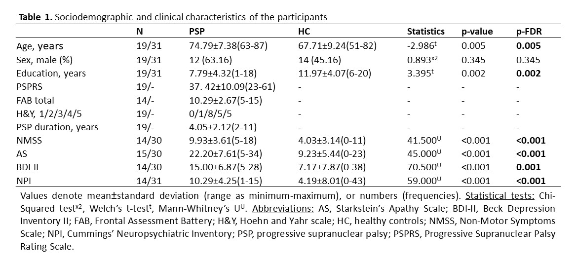 Method: Nineteen patients with PSP and 31 sex-matched healthy controls (HC) were assessed using diffusion-weighted magnetic resonance imaging (MRI). The severity and progression of PSP were clinically evaluated using the Progressive Supranuclear Palsy Rating Scale (PSPRS). Automated DTI-ALPS indices were computed for the left and right hemispheres, and bilaterally. Between-group comparisons were performed for the demographic, clinical and DTI-ALPS variables, controlling by age and years of education. Correlations between demographic and clinical features and DTI-ALPS indices were computed. All the results were corrected by false discovery rate (FDR, p<0.05).