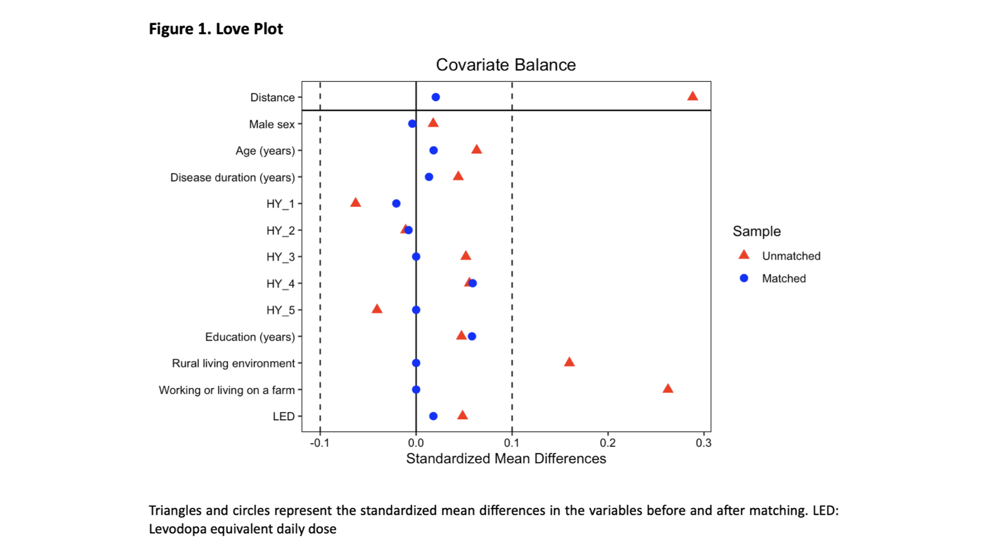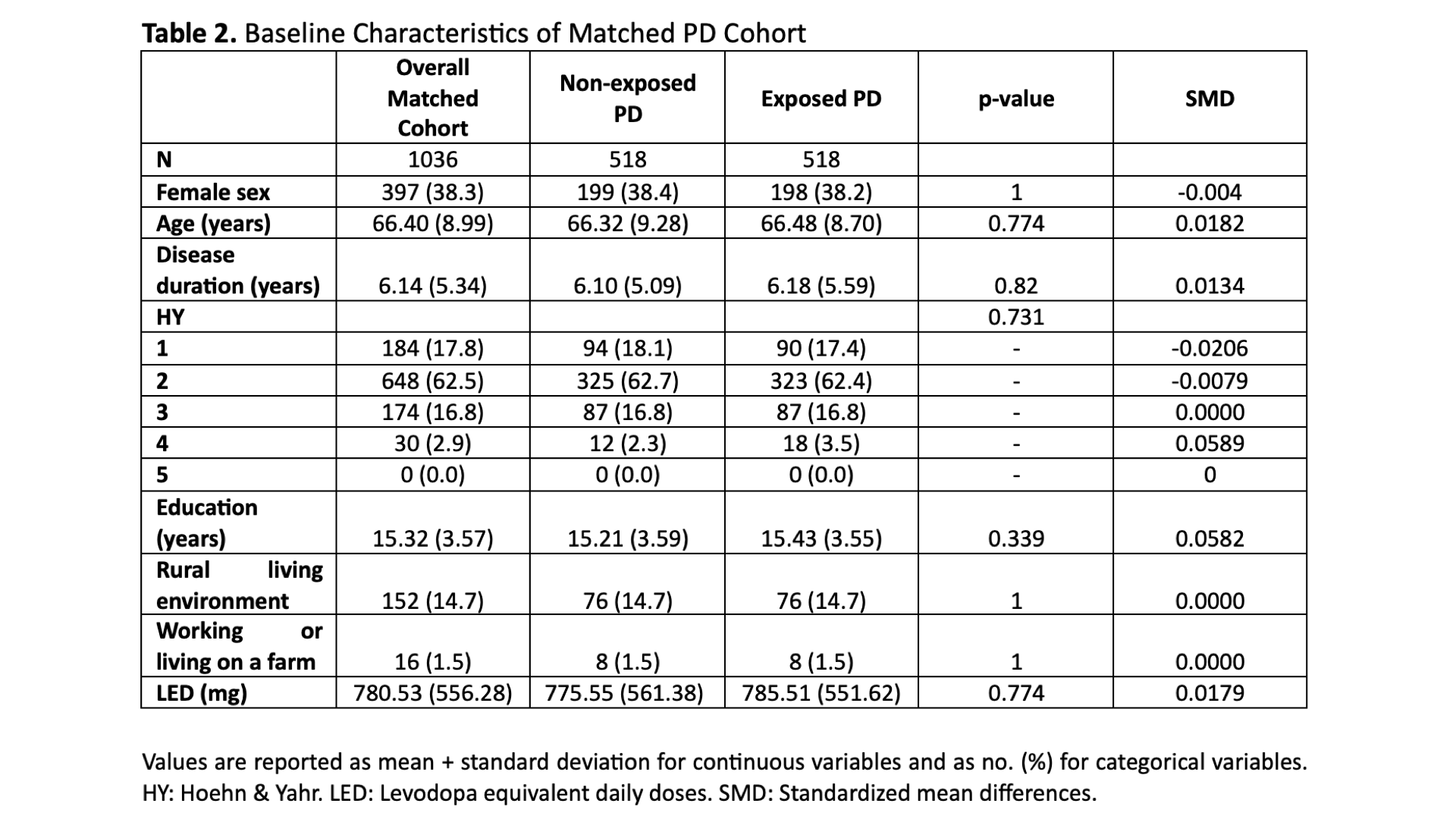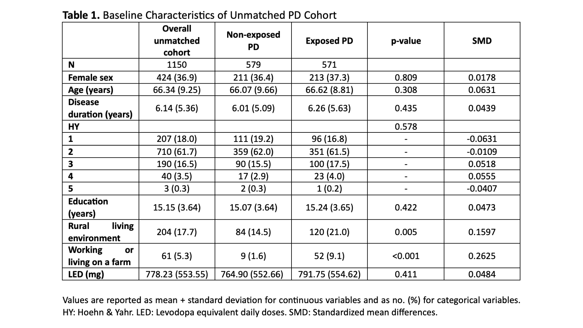 Method: Clinical outcomes of pesticide exposed (EPD) and non-exposed PD (NEPD) participants from the COPN cohort were analyzed. PSM was used to adjust for confounders: age, sex, disease duration, Hoehn & Yahr, education, levodopa equivalent dose, living environment, and history of working or living on a farm. Only patients with complete covariate data were included for matching. Nearest-neighbor matching (1:1, caliper=0.1) was applied.  Clinical outcomes were compared between EPD and NEPD groups, including age at onset (AAO), MDS-UPDRS subscales, and motor and non-motor symptoms. Analysis of covariance was used for continuous variables and multivariable logistic regression to determine the adjusted odds ratios (ORs) for categorical variables.