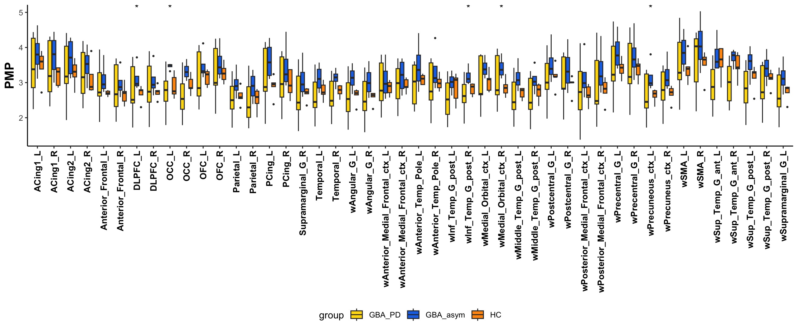 Results: Age and sex did not differ significantly between groups. Median disease duration in GBA-PD was 36 months, and MoCA scores were similar between GBA-PD and GBA-NMC. GBA-PD showed lower PMP k3 in 38 of 48 cortical regions compared to HC, though differences were not statistically significant. In contrast, GBA-NMC exhibited higher PMP k3 in multiple cortical regions compared to HC, with significant increases in the left precuneus, dorsolateral prefrontal, and occipital cortices, as well as right posterior inferior temporal gyrus and medial orbital cortex. Trend-level increases were observed in the right precuneus and anterior cingulate, and in the left posterior cingulate, medial orbital, anterior frontal, and temporal cortice.