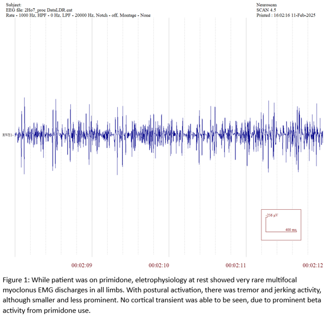 Method: A 49-year-old man with history of generalized epilepsy and intellectual disability presented for worsening tremors. Family history was notable for the patient’s daughter having similar neurodevelopmental delays and epilepsy. The patient’s seizures were well-controlled on carbamazepine currently, but had previously been on ethosuximide and topiramate. Patient was diagnosed with essential tremor (ET) locally and initiated on primidone. While patient reported subjective benefit of primidone (250 mg/day), tremors were increasingly disabling. Movement exam noted a jerky myoclonus across upper and lower limbs accentuated by action, as well as superimposed mild ataxia and wide based gait, without parkinsonism.