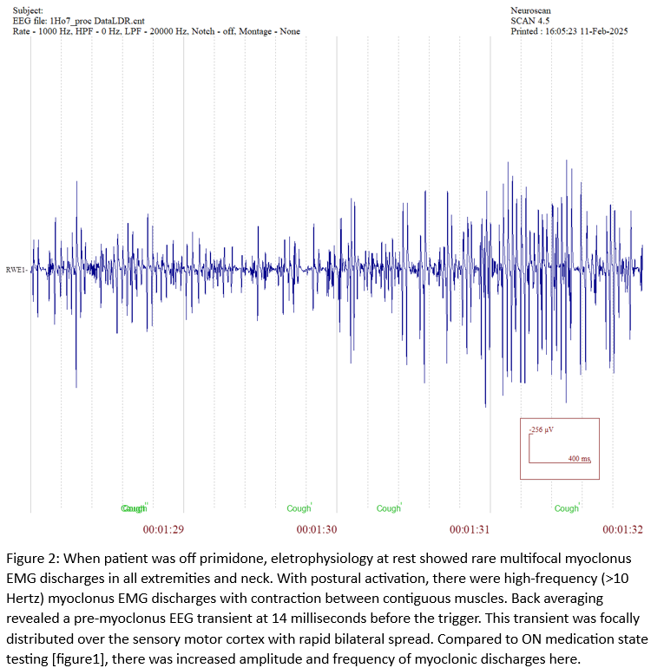Results: Genetic testing showed a heterozygous pathogenic variant of the DHDDS gene, c.632G>A (p.Arg211Gln), consistent with an autosomal dominant DHDDS-related neurodevelopmental disorder. Patient increased primidone up to 300 mg/day with improvements. By neurophysiologic study, we 1) confirmed that patient’s abnormal movements are not characteristic of ET but instead diagnostic of cortical origin myoclonus, and 2) objectively demonstrated improvement of myoclonic discharges when patient was on [figure1] vs. off [figure2] primidone.