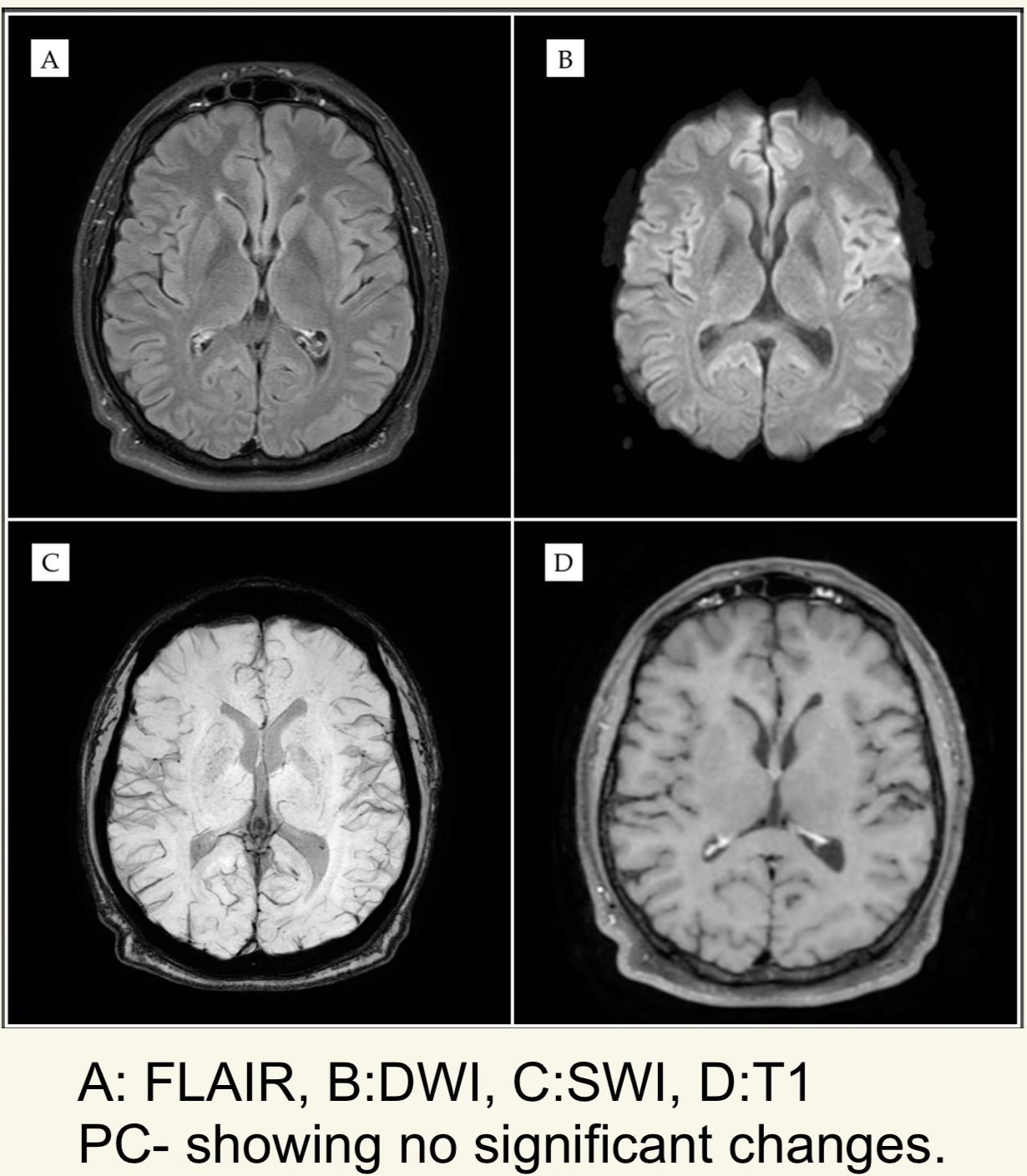 Method: A 57-year-old male presented with 4 months history of progressive bradykinesia, resting tremors, postural instability along with daytime somnolence, apathy, and cognitive decline (memory deficits, speech changes). He had childhood-onset refractory focal seizures managed with antiseizure medication,diabetes and hypertension. On examination, he exhibited masked facies, hypophonic speech, impaired vertical gaze, symmetrical rigidity, bradykinesia, and resting/postural tremors (MDS-UPDRS: 40).