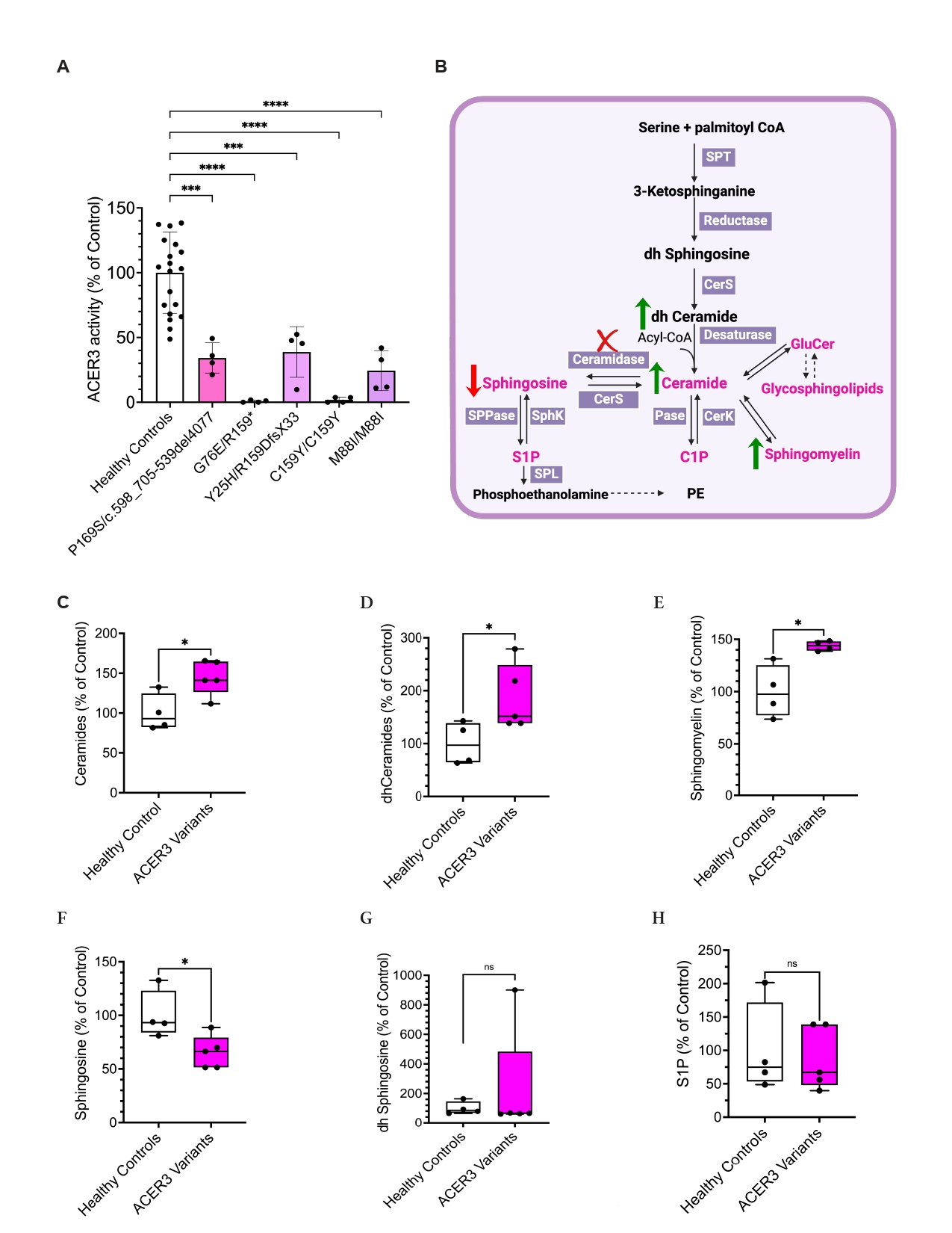 Method: Exome sequencing, data sharing, screening the genetic databases of several international genetic laboratories, and GeneMatcher were used to identify the patients here. ACER3 enzyme activity, lipidomics in patient fibroblasts, mutagenesis, functional assays, and protein modeling were performed.