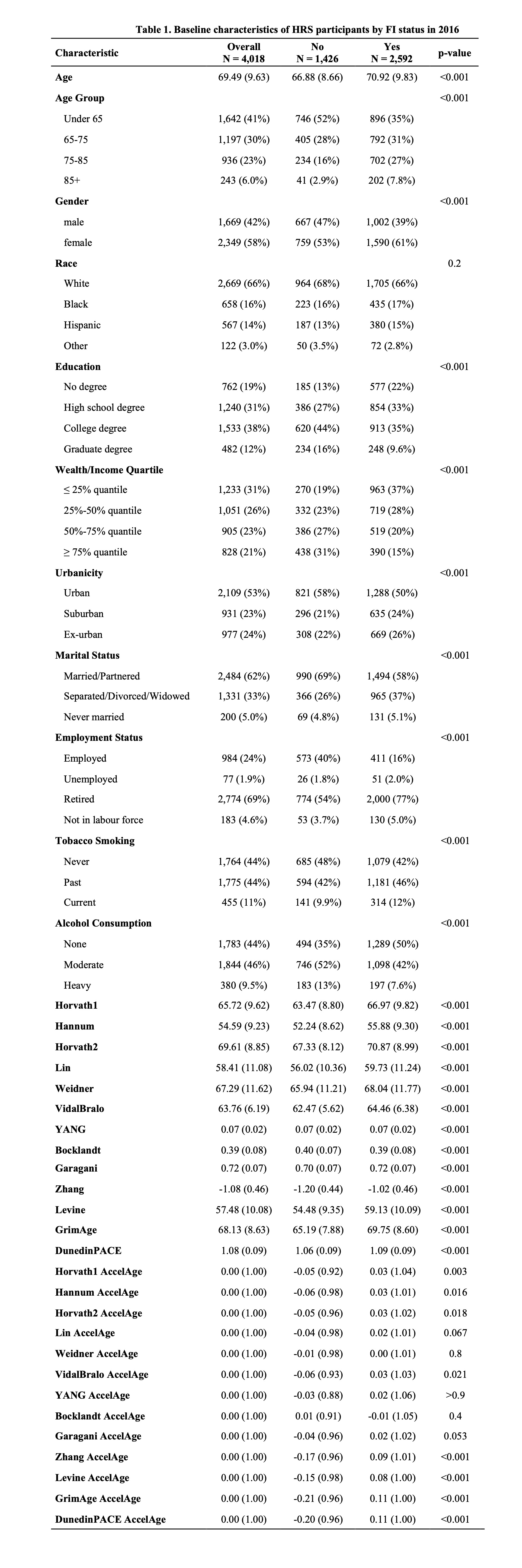 Method: We used biennial data from the Health and Retirement Study (2006–2022, N=4018) to detect the bidirectional relationship between 13 DNAm aging clocks and corresponding AgeAccel measures with frailty. Frailty was quantified using a 32-item deficit Frailty index (FI), 5-item Fried Phenotype (FP) and 5-item intrinsic capacity (IC) simultaneously. AgeAccel measures were calculated as residuals from regressing epigenetic age on chronological age for each clock. Physical disability was assessed using self-reported activities of daily living (ADL) and instrumental ADL (IADL). To evaluate associations of epigenetic aging with frailty prevalence, history, and incidence, we applied logistic (cross-sectional), linear (retrospective), and Cox (prospective) regression models, respectively. Furthermore, we implement mediation analyses to quantify epigenetic aging’s role in mediating frailty-driven disability and mortality. All above models were progressively adjusted for key covariates.