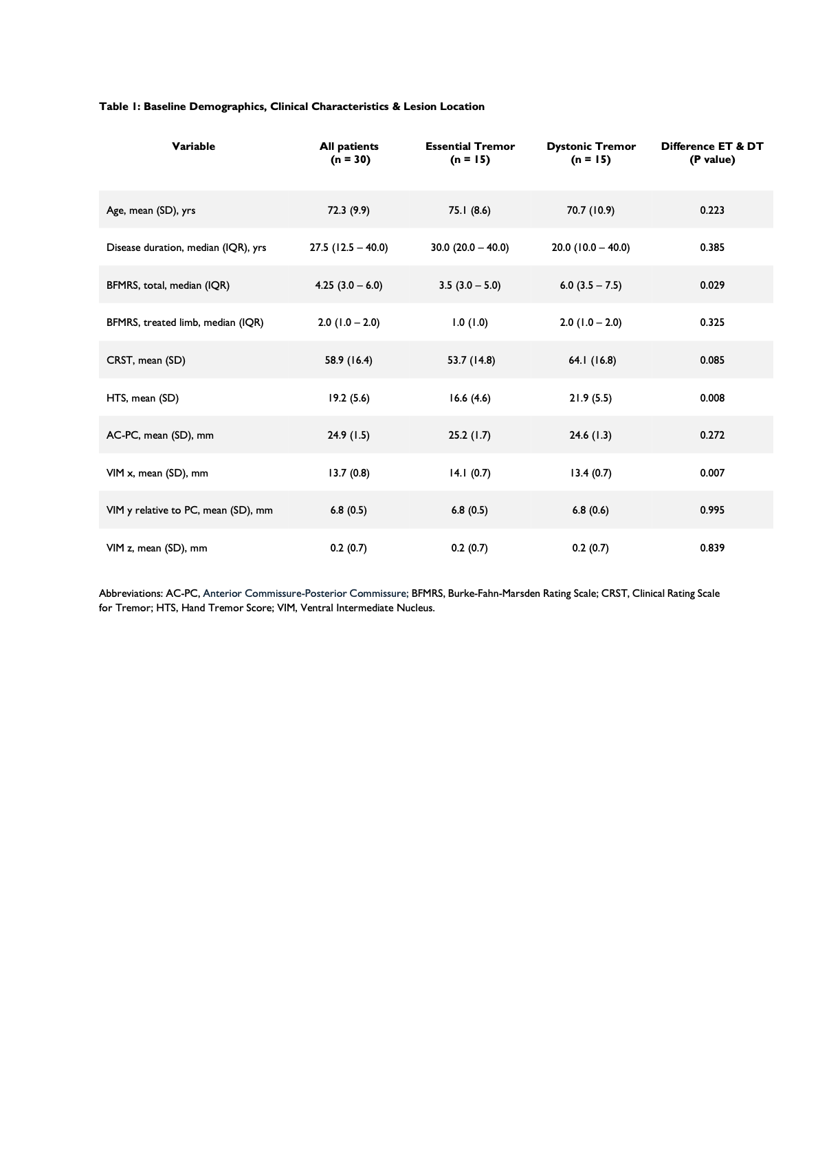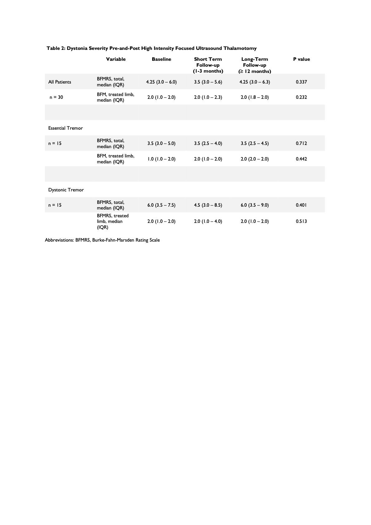 Results: Among the 119 patients treated with a unilateral HiFUS ablation between the time interval, 30 patients (15 ET and 15 DT) met the inclusion criteria. The mean cohort age was 72.3 yrs (±9.9) with a median disease duration before treatment of 27.5 yrs (12.5 – 40.0) (Table 1). As expected, DT patients had a greater total BFMRS than ET patients at baseline (DT: 6.0 (3.5 – 7.5); ET: 3.5 (3.0 – 5.0), p=0.029). Though this was not reflected by dystonia in the treated limb (DT: 2.0 (1.0 – 2.0); ET: 2.0 (1.0 – 2.0), p=0.325). The total BFMRS did not significantly change at the short or long-term follow-up in either ET or DT cohorts.  In the DT patients, the total BFMRS upper interquartile range (IQR) increased from 7.5 to 9.0 at the long-term follow-up, suggesting a small shift towards higher total BFMRS in this cohort (Table 2).