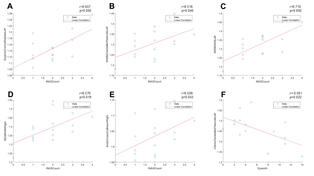 Results: Individuals with SCA6, compared to non-ataxic controls, exhibited significant volumetric reduction in cerebellar white matter, cortex, and several lobules. There was increased axial diffusivity (AD) in the left inferior cerebellar peduncle, left middle cerebellar peduncle, left superior cerebellar peduncle, left superior corona radiata, left fornix-stria terminalis, left sagittal stratum, left genu of the corpus callosum, left midbrain, right cerebral peduncle, right fornix-stria terminalis, right middle cerebellar peduncle, right body of the corpus callosum, right midbrain, and left optic tract [figure 1]. Significant correlations were found between AD and the Inventory of Non-ataxia Symptoms Count and the Epworth Sleepiness Scale [figure 2].