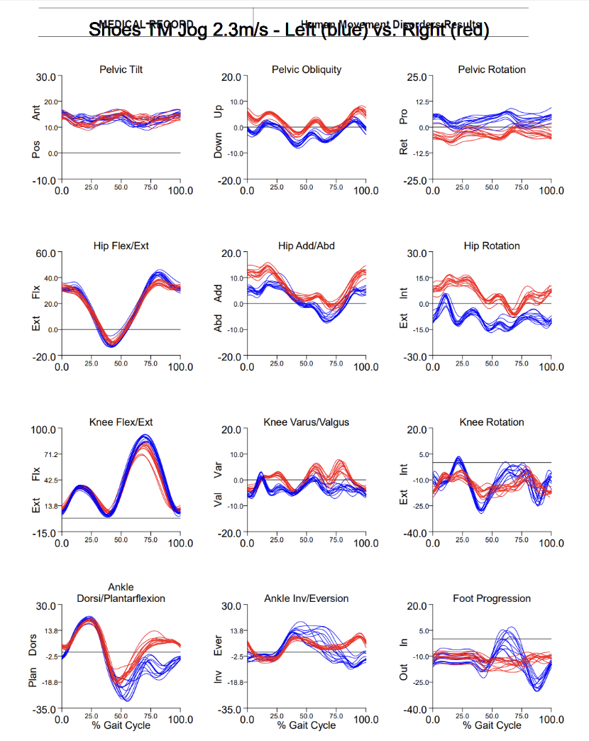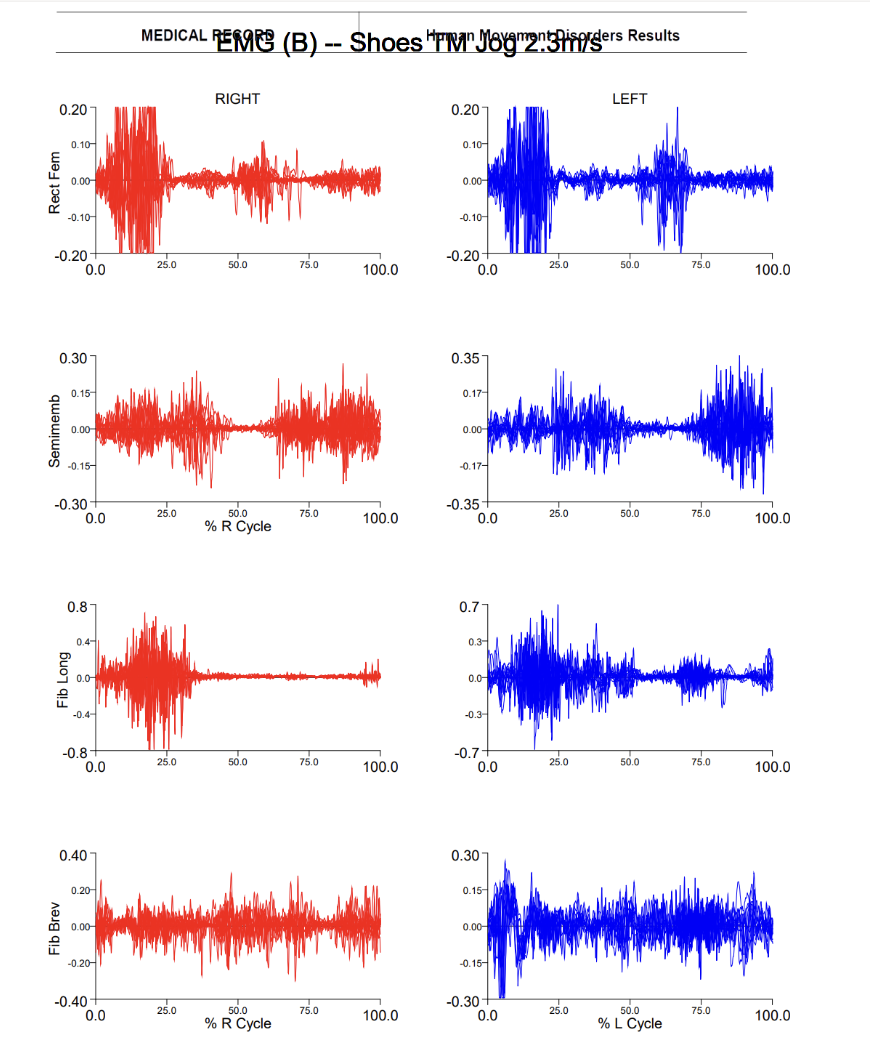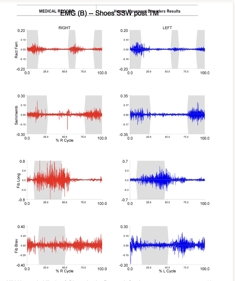 After she returned to baseline, she was evaluated at NIH. Clinical assessment and computerized motion analysis confirmed task-specific RD. Gait analysis revealed left-sided pelvic protraction, knee hyperextension, and most prominently, ankle eversion with an eversion/plantarflexion “whip”. EMG indicated abnormal timing of muscle activation only with running in evertor muscles. She was re-trialed on a lower dose for toxin, targeting fibularis muscles and plantar flexors, which improved her mileage to 50-60 miles per week.