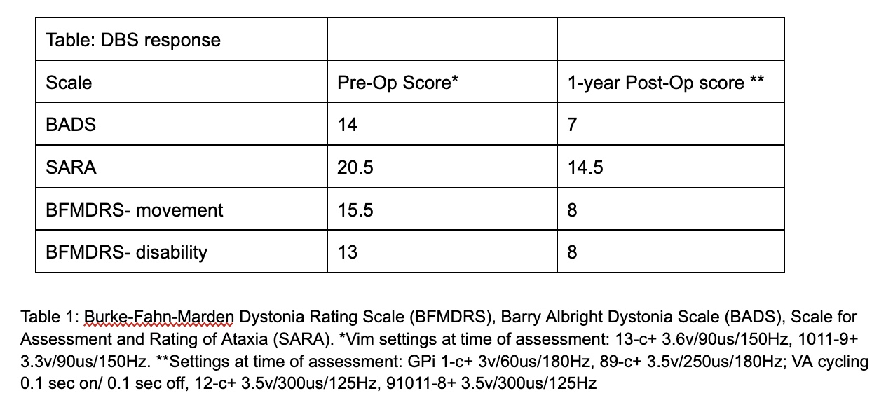 Pre and one-year post-operative scores were examined to determine improvement in symptoms using Burke-Fahn-Marsden Dystonia Rating Scale (BFMDRS), Barry Albright Dystonia Scale (BADS), Scale for Assessment and Rating of Ataxia (SARA).