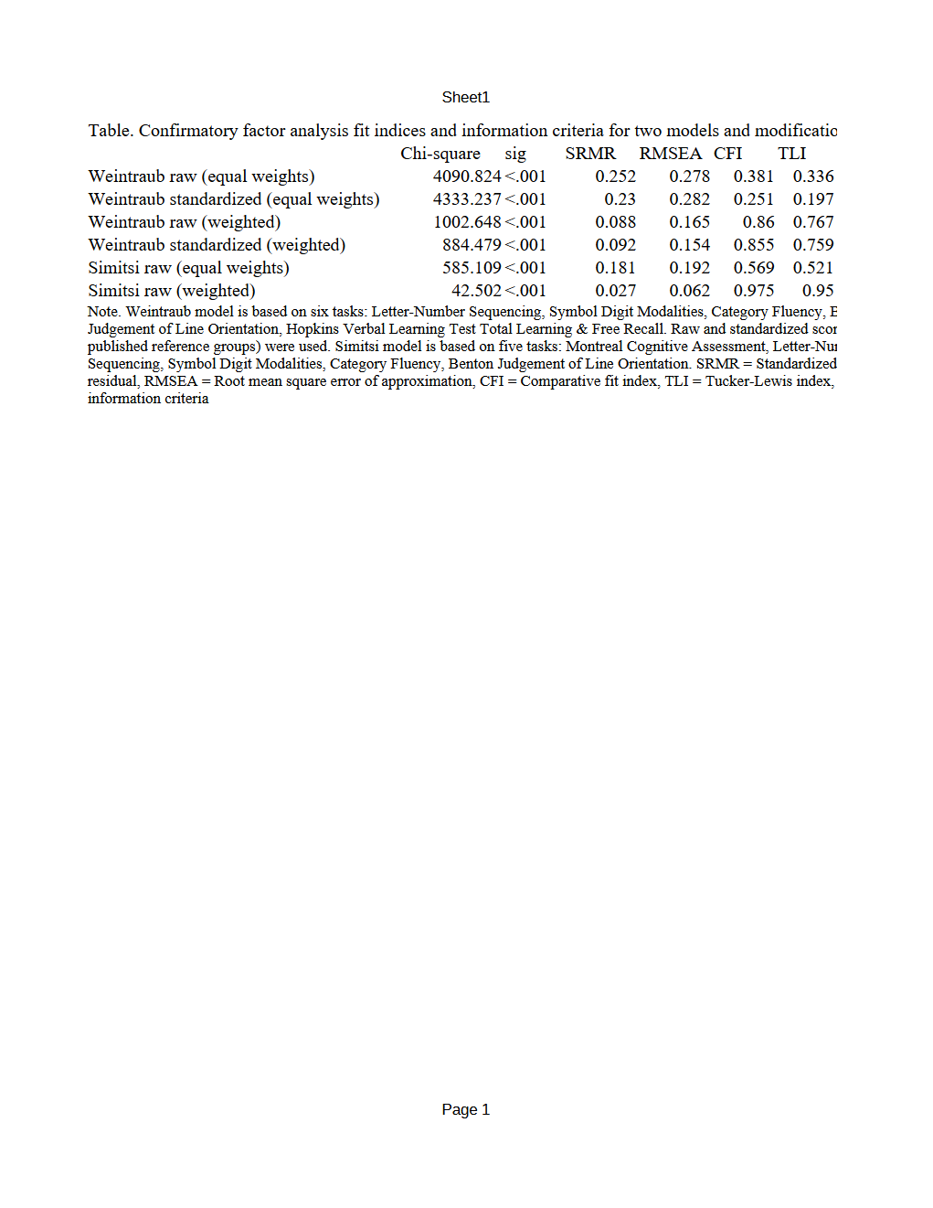 Method: We reanalyzed PPMI (March 2025 freeze) selecting individuals at baseline who had completed: Montreal Cognitive Assessment, Letter-Number Sequencing, Symbol Digit Modalities, Category Fluency, Judgement of Line Orientation, and Hopkins Verbal Learning Test. We used confirmatory factor analysis to test two PCCs—Weintraub’s (6 tasks, standardized & raw scores) and Simitsi’s (5 tasks, raw scores)—using robust Satorra-Bentler maximum likelihood estimation. We also compared the validity of weighted (i.e., freely estimated) versus unweighted (i.e., tau-equivalent) PCCs. Validity was evaluated with five fit indices: chi-square, standard root mean residual, root mean square error of approximation, comparative fit index, Tucker-Lewis index.