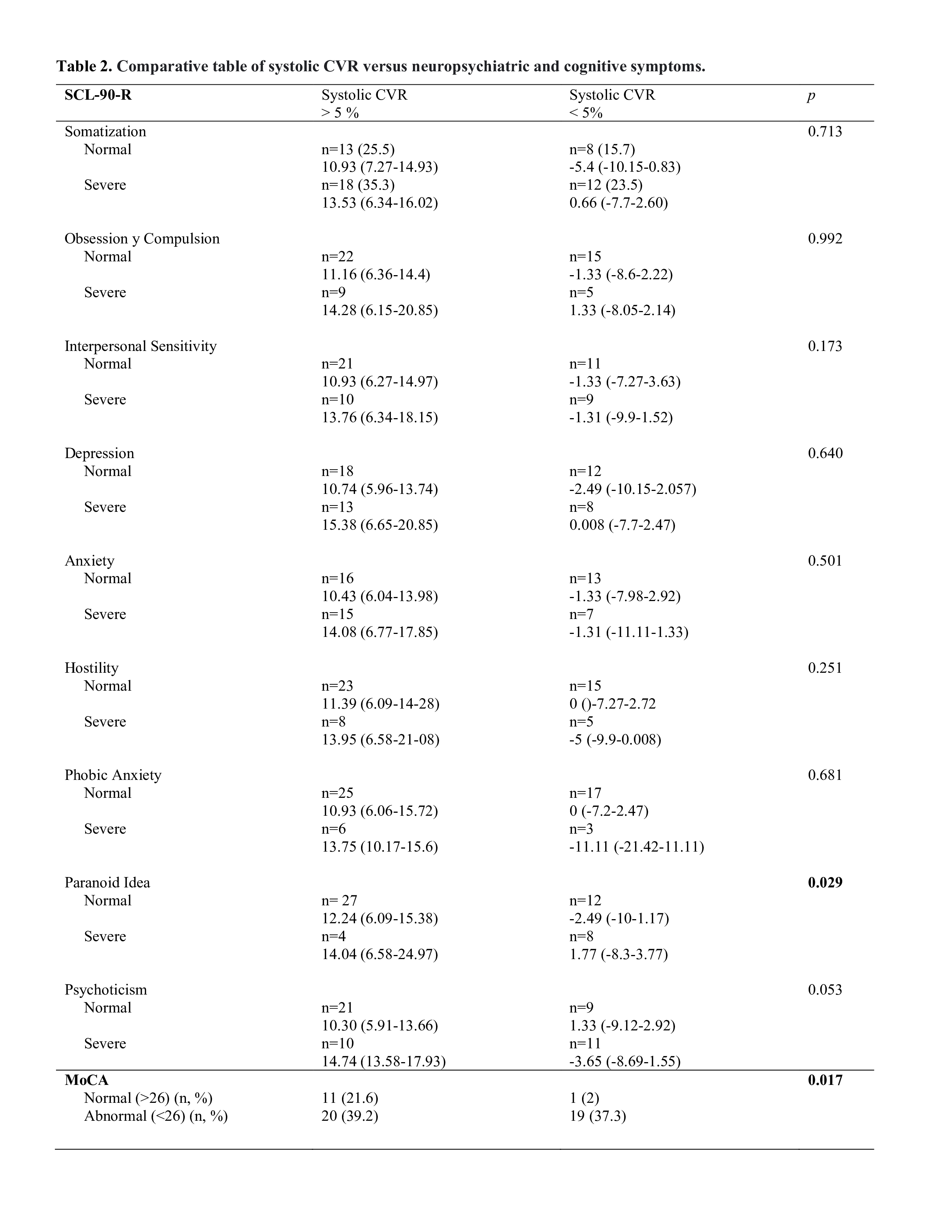 Results: Fifty-one patients were included, 62.7% (n=32) male, general population with a median age of 66 years (IQR 57-69), median age of onset of symptoms 58 years (IQR 42-63) and of diagnosis of PD 57 years (IQR 44.5-62.25). The median MDS-UPDRS score was 58 (IQR 35-77) and median H&Y score was 2 (IQR 2-4) [Table 1]. CVR impairment in 31 (60.7%), there was statistical trend toward better CVR in females, however, this was not statistically significant (p=0.065). The model identified that the MoCA score was significantly associated with CVR (p=0.017), while the NMSS showed a trend toward significance (p=0.065). For systolic CVR, a contingency table was created between the presence of psychopathological symptoms versus the presence of CVR impairment. Statistical significance was only evident in paranoid ideation (p=0.029) [Table 2].