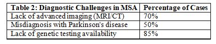 Conclusion: The lack of effective disease-modifying therapies and multidisciplinary care systems makes it difficult to provide optimal care for MSA patients. Strengthening healthcare infrastructure, training healthcare professionals in movement disorders, and improving access to diagnostic tools are essential to enhancing the management of MSA in resource-constrained environments.