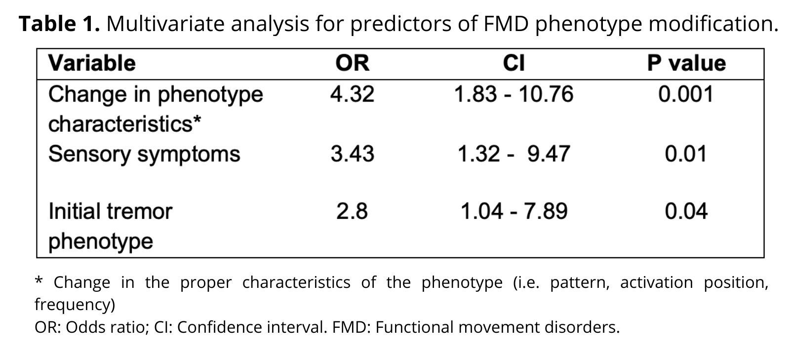 Patients who did not modify the phenotype (NMP, n=58) were more likely to have a poorly defined initial phenotype (19% vs 2%) than patients who did modify the phenotype (MP, n=47), who had more well-defined initial phenotypes, but were less stable over time (p < 0.05). Additionally, MP patients showed more changes in phenotype characteristics (i.e., pattern) (47% vs 26%), constant FMD (47% vs 29%), fatigue (45% vs 24%) and sensory symptoms (32% vs 19%) than NMP (p < 0.05). Multivariate analysis indicated that an initial tremor phenotype, adjusted for changes in phenotype characteristics and sensory symptoms, could predict future phenotype modification [table 1].