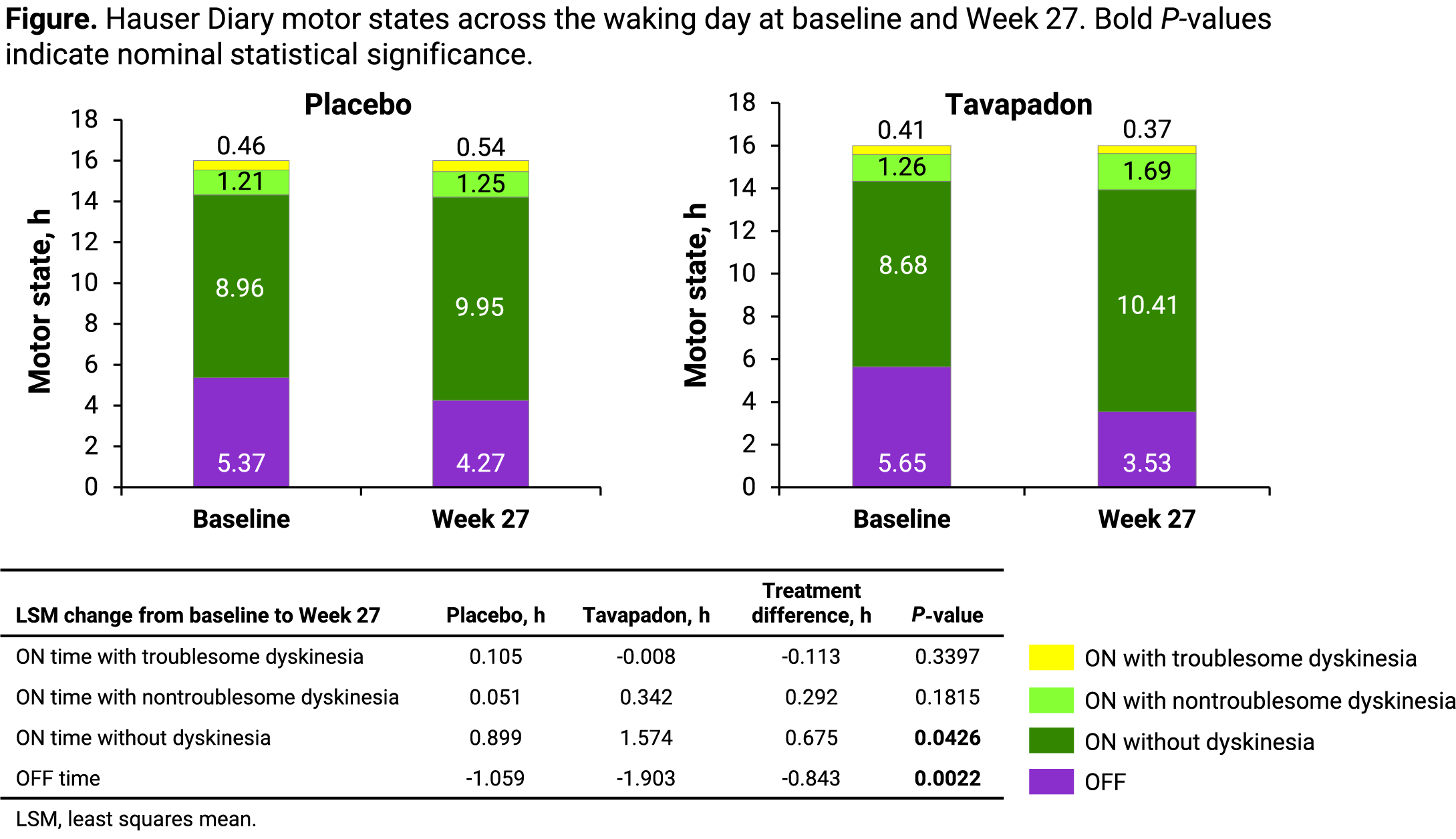 Method: Changes in motor states during the waking day (ON time without dyskinesia, ON time with troublesome dyskinesia, ON time with nontroublesome dyskinesia, and OFF time) were evaluated at baseline and Week 27 using the Hauser diary. Post hoc analyses compared changes in motor states normalized over the 16-hour waking day, and morning akinesia with tavapadon (5-15 mg once daily) versus placebo using a mixed effects model for repeated measures.