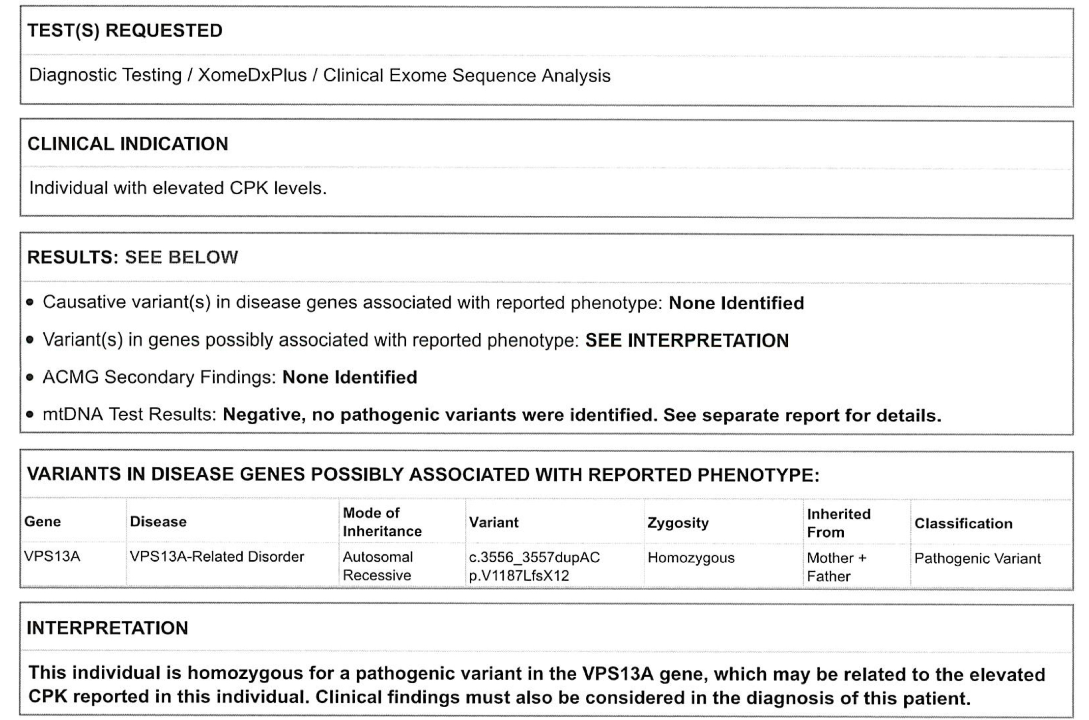 Case C: A 16-year-old male was found to have unexplained elevated hepatic enzymes and CPK levels during a hospitalization for pancreatitis at age 14. He later underwent genetic evaluation, which confirmed ChAc with a homozygous VPS13A pathogenic variant. He sought neurological evaluation but remains asymptomatic for now.
