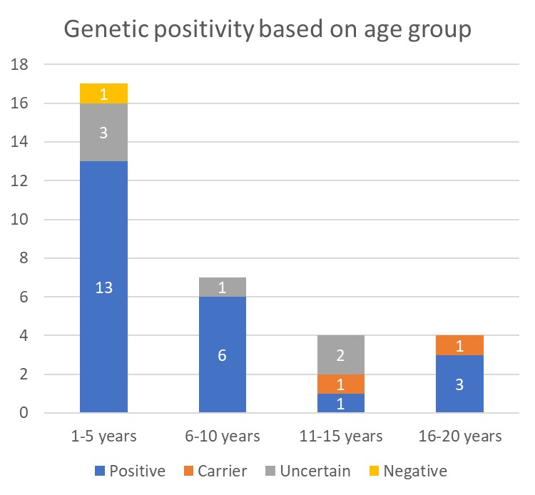 Results: We screened 38 patients of EOCA after excluding acquired causes. An additional 6 patients were excluded as they were positive for SCA1,2,3,12, or FA. The remaining 32 patients (Males: 12) underwent WEMS. The mean age at onset was 7.23±5.51 years (Range: 1-19 years) with a duration of illness of 6±6 years. 12 patients (37.5%) had consanguinity, while 5 (15.6%) had a positive family history. Ataxia was present in all. Dystonia (n=19, 59.4%) was the next common phenomenology. Abnormal fundus was noted in 9 patients (28.1%), abnormal ocular findings in 32 (100%), dysarthria in 26 (81.3%), and pyramidal signs in 14 (43.8%). The most common gait pattern was ataxic (24 patients, 75%). The mean ICARS and SARA scores were 33.25±14.46 and 12.8±5.46, respectively. Abnormal NCS was noted in 15 patients (46.9%) and abnormal MRI in 27 (84.4%).Twenty-three cases (71.9%) had a definite genetic etiology of which ATX-APTX (n=3), ATX-SETX (n=2),ATX-ATM (n=2), and ATX-CACNA1A (n=2) were the commoner ones [Figure1]. The genetic yield was highest in the 5-10 years age-of-onset subgroup (6/7, 85.7%), followed by 1-5 years (13/16, 81.3%) [Figure2].