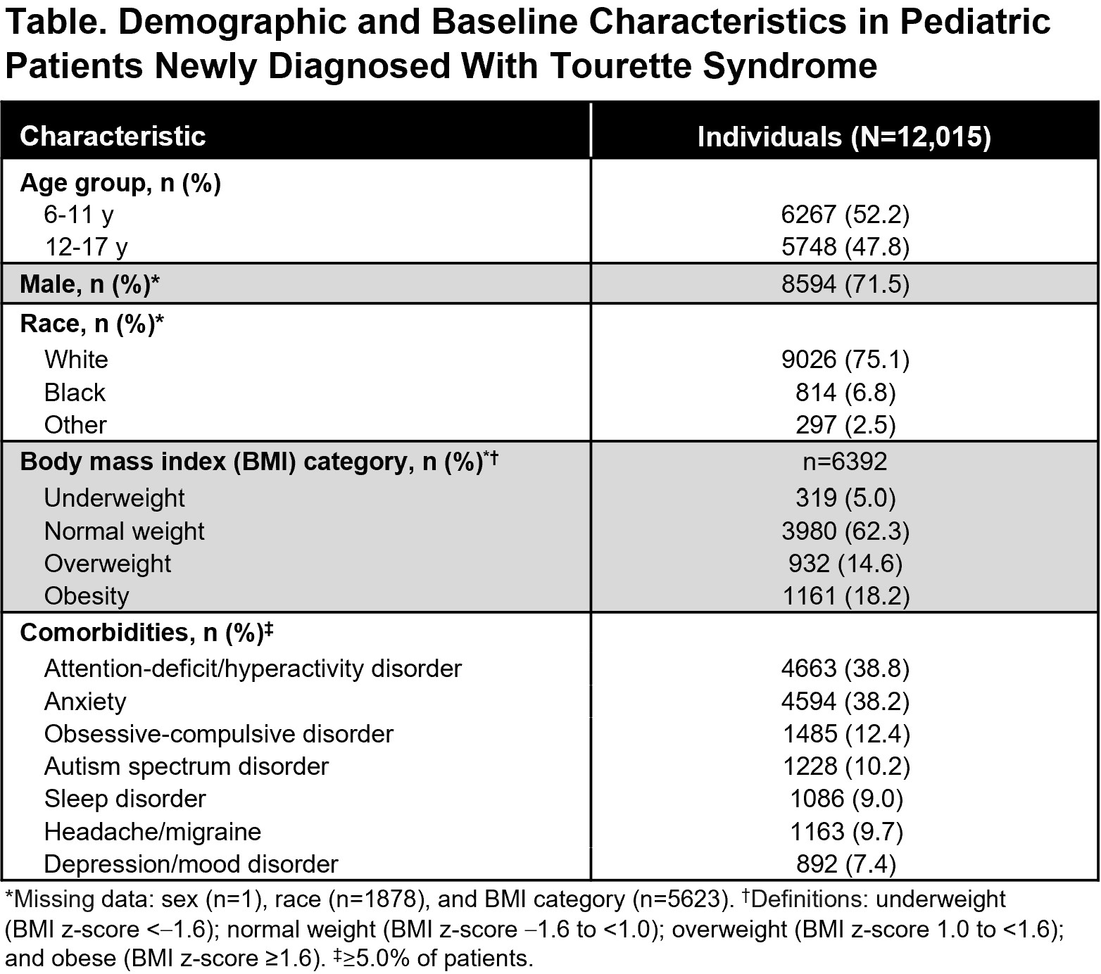 Method: Data (10-year identification period) were analyzed from a US health records database of pediatric patients newly diagnosed with TS. The cohort was stratified by D2RA medication use via identification of at least 1 D2RA medication record (indexed on date of first medication record). A minimum of 1 provider encounter was required at least 18 months prior to index date and during 18-month follow-up period. A record of medication use was calculated monthly.