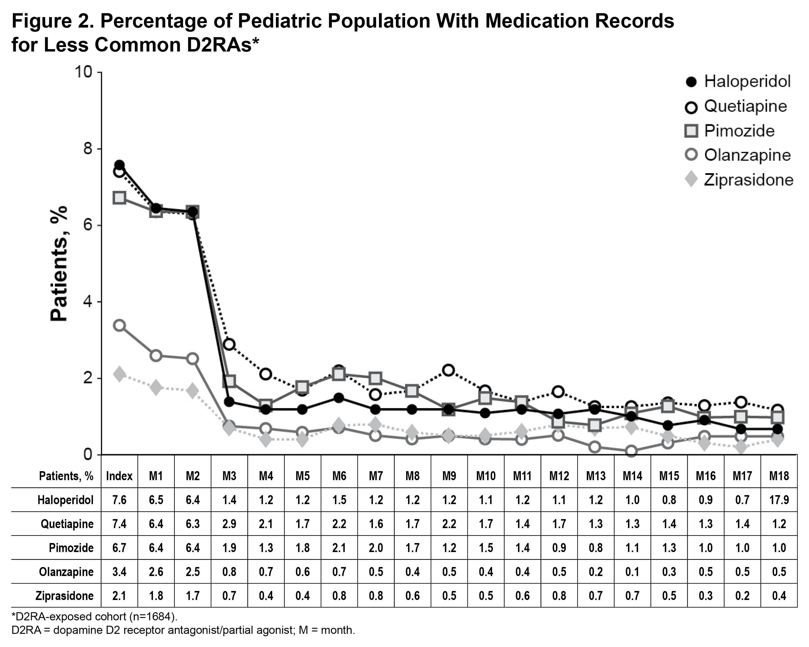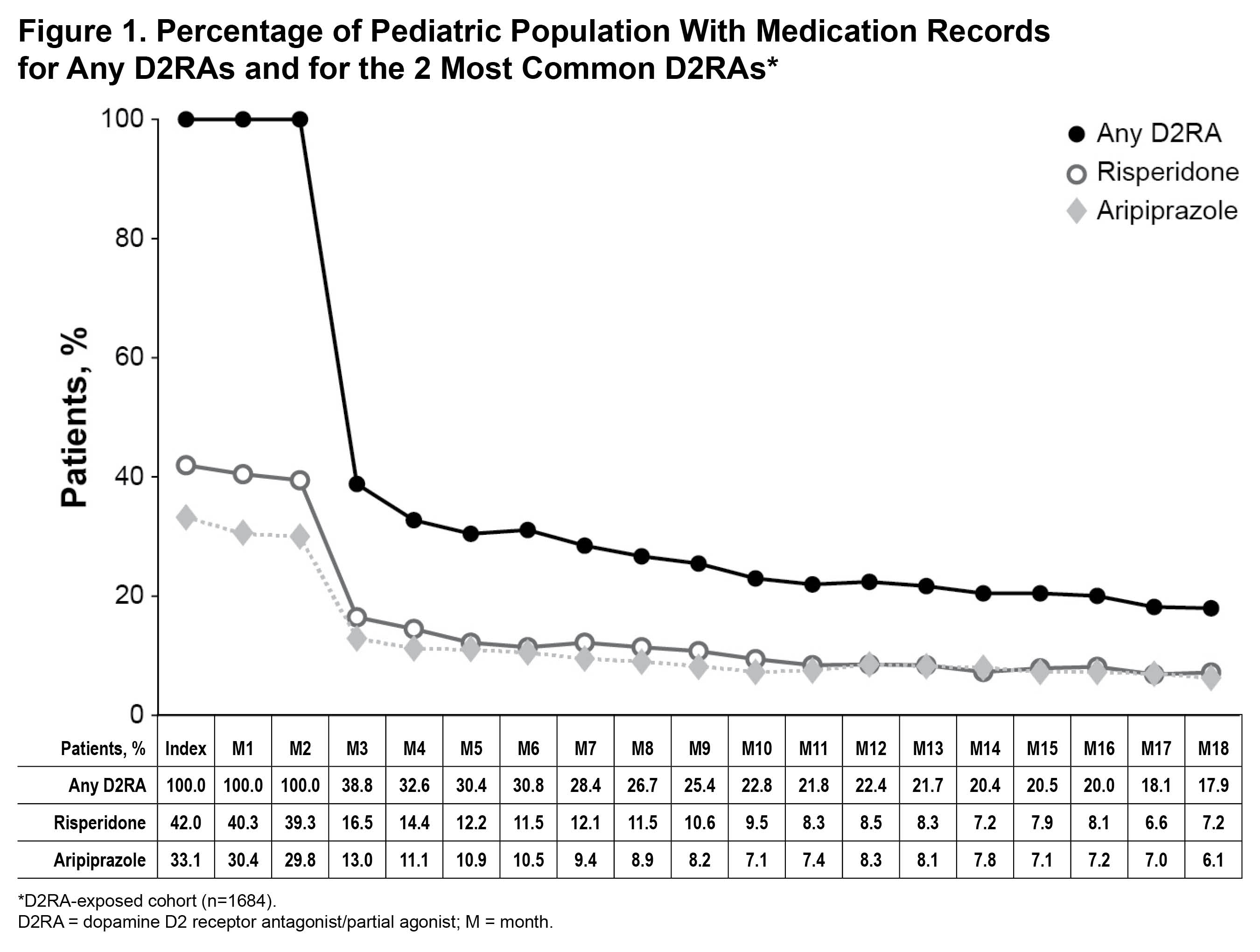 Conclusion: A large percentage of children had psychiatric comorbidities at the time of first D2RA use. D2RA treatment decreased considerably during the 18 months following initiation, with up to 61.2% of individuals no longer having evidence of D2RA use (suggesting discontinuation) by Month 3 and 82.1% by Month 18.