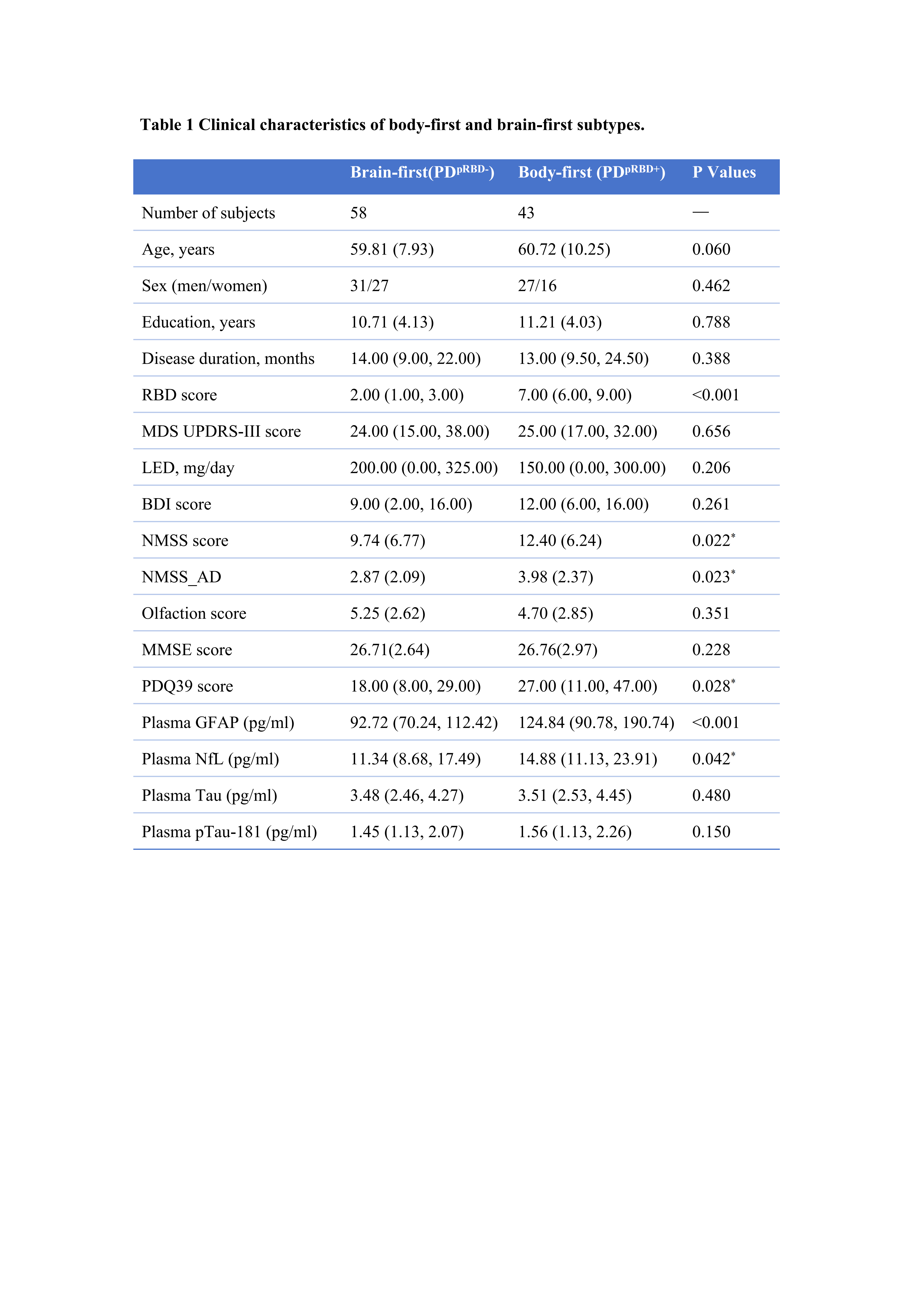 Objective: To investigate clinical characteristics, disease progression, potential plasma and imaging biomarkers of body-first and brain-first Parkinson’s disease (PD) subtypes.