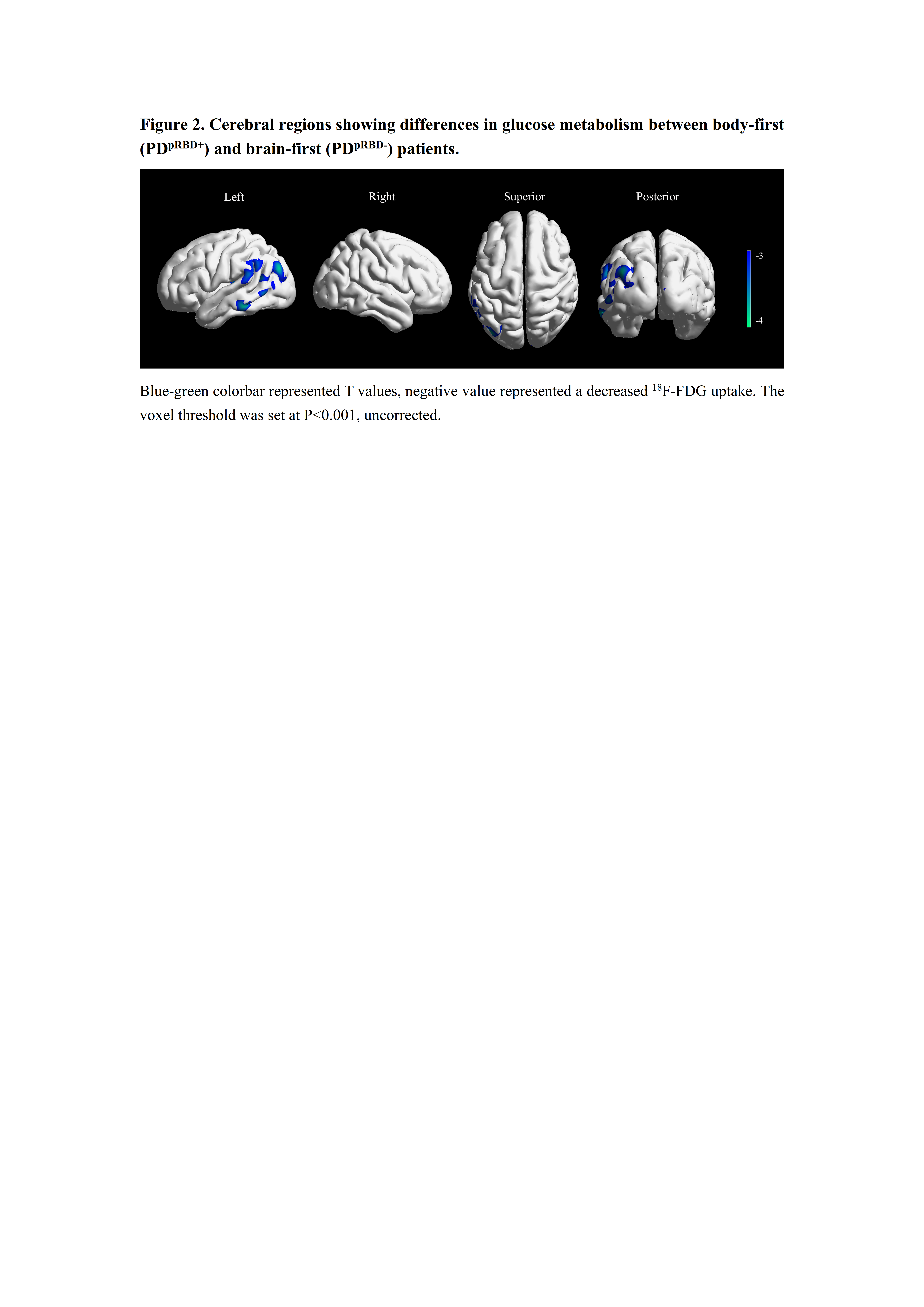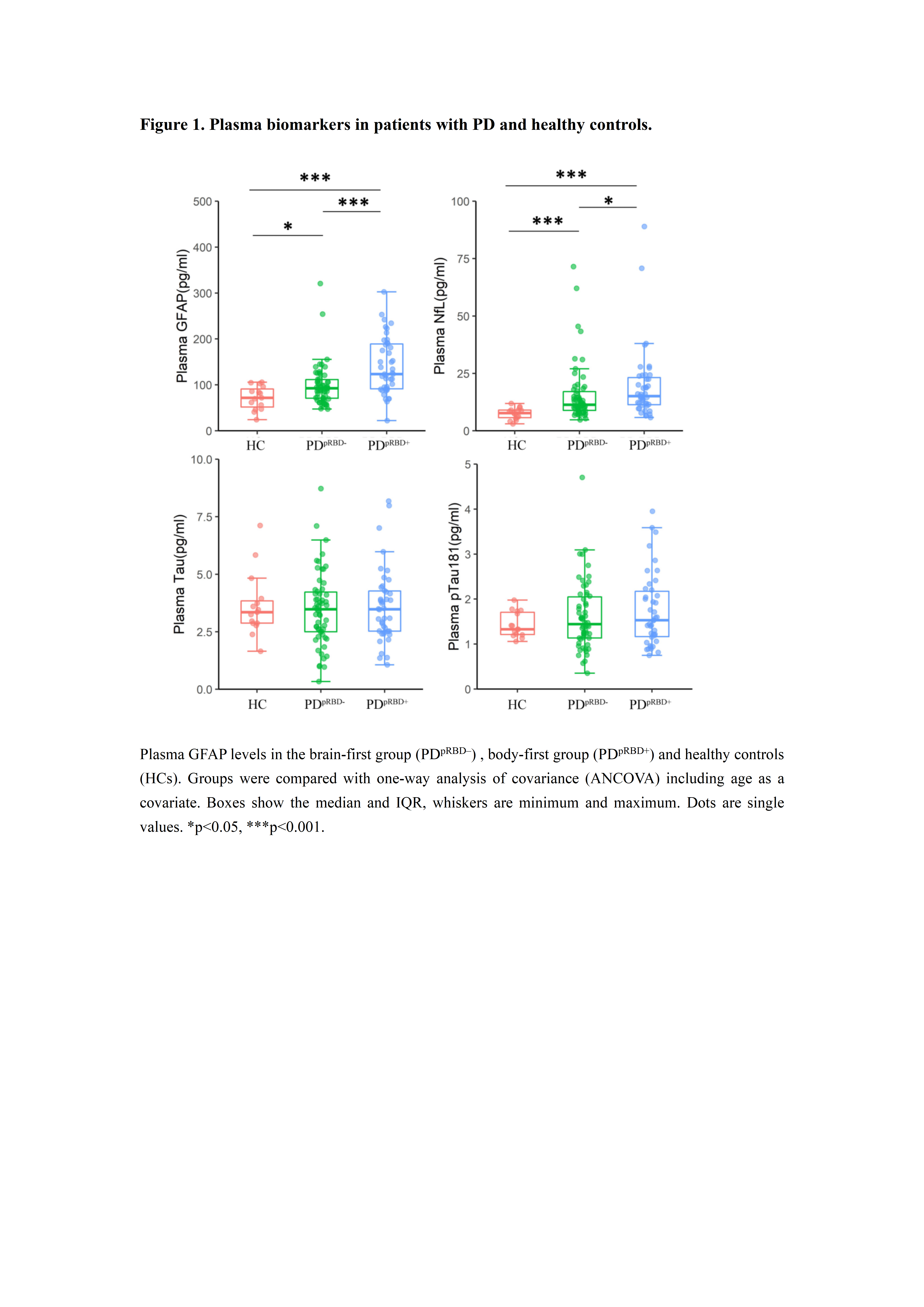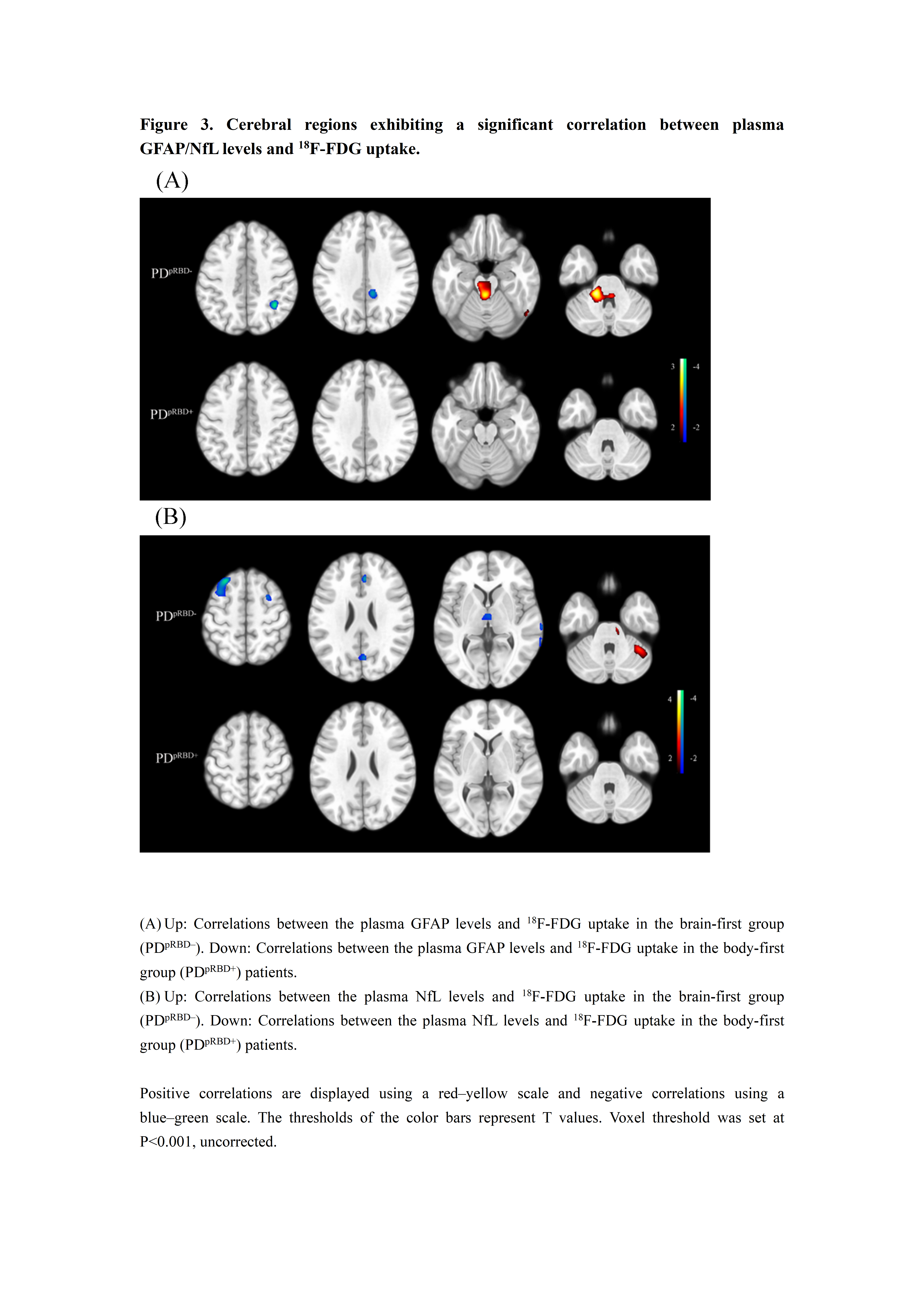 Method: The longitudinal cohort study enrolled 101 PD patients and 15 healthy controls (HCs). The REM Sleep Behavior Disorder Screening Questionnaire (RBDSQ) classified patients as body-first (n=58; RBDSQ≥6, RBD-positive at motor symptom onset) or brain-first (n=43; RBDSQ<3). Participants were followed for an average of 63.58 months. Plasma glial fibrillary acidic protein (GFAP), neurofilament light chain (NfL), Tau, and phosphorylated Tau-181 (pTau-181) were measured using Single Molecule Array (SimoA). All participants underwent 18F-fluorodeoxyglucose positron emission tomography (18F-FDG PET) to assess cerebral glucose metabolism.