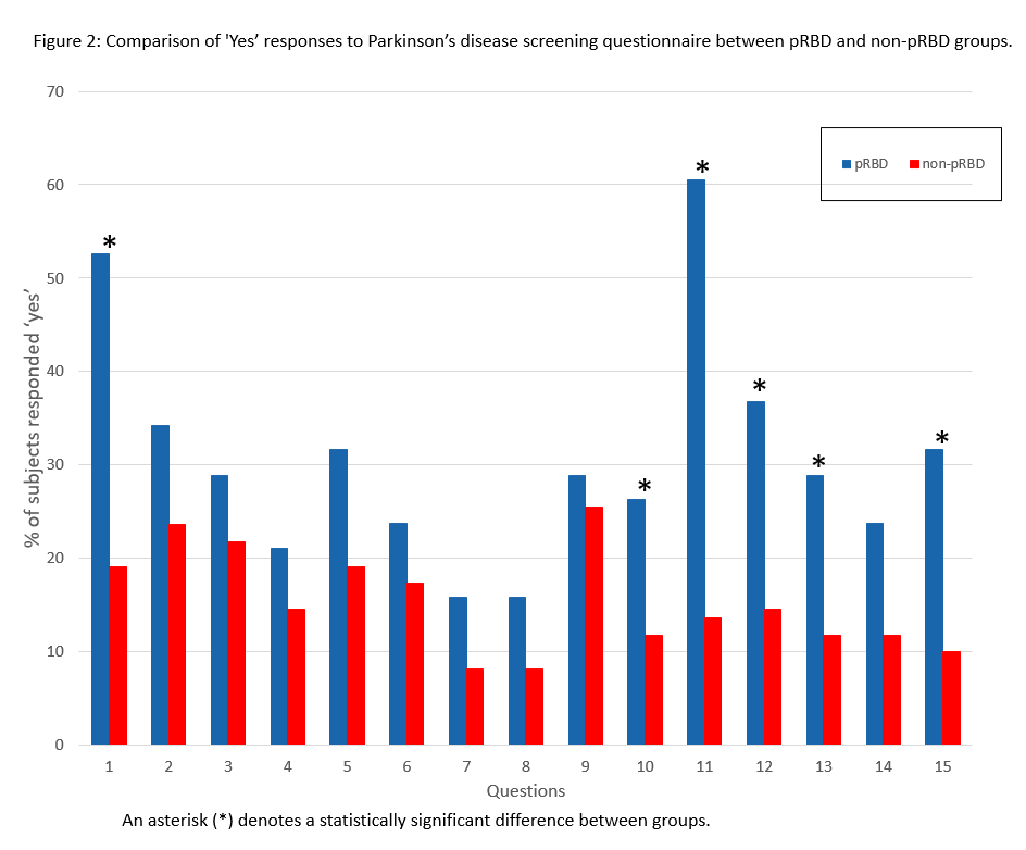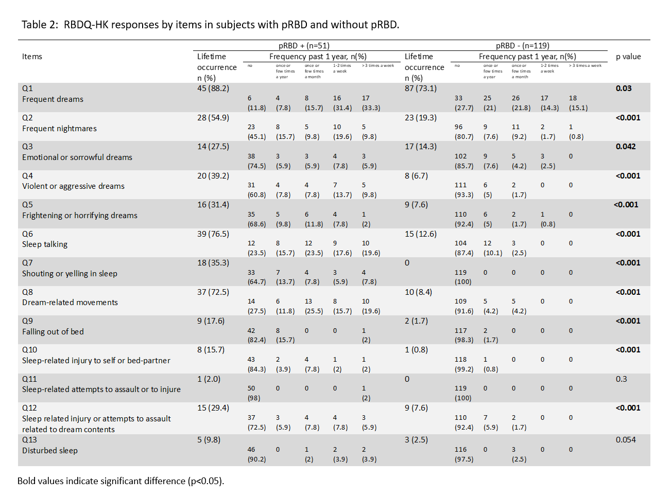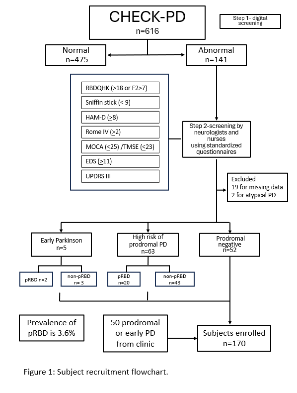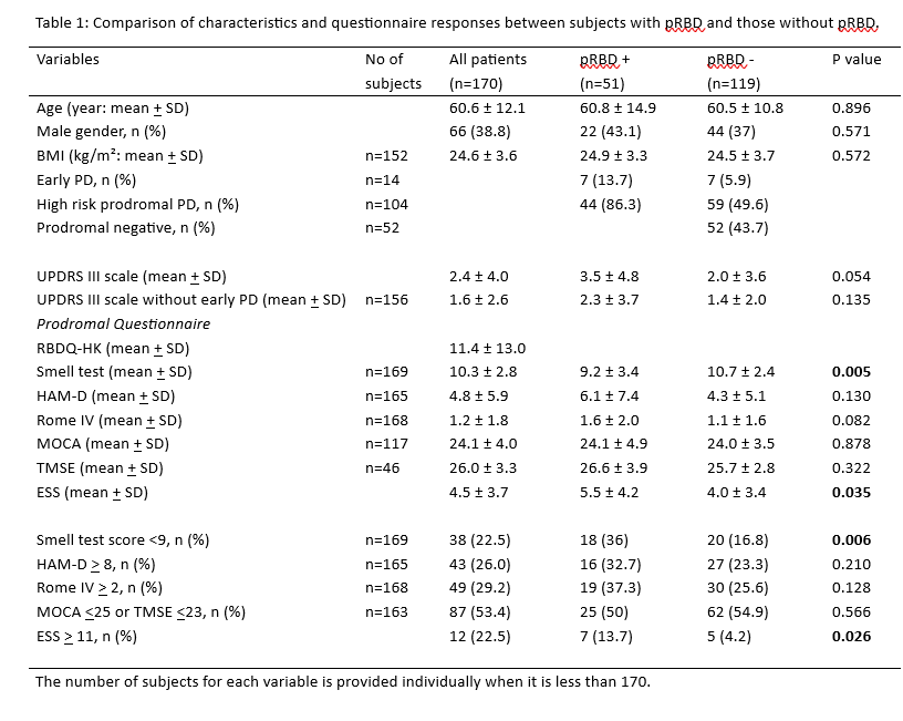 Method: A total of 616 individuals were screened between July and August 2024. The screening was conducted using CHECK-PD, a smartphone application which incorporates validated PD screening questions with voice and motor analysis. Individuals screened abnormal were further evaluated clinically and classified as early PD, high risk of prodromal PD (if positive for any prodromal indicators) or prodromal negative. pRBD is diagnosed when RBDQ-HK scores>18 or factor2 score>7. Self-reported RBD characteristics from RBDQ-HK and PD screening questionnaires were compared between pRBD and non-pRBD groups.