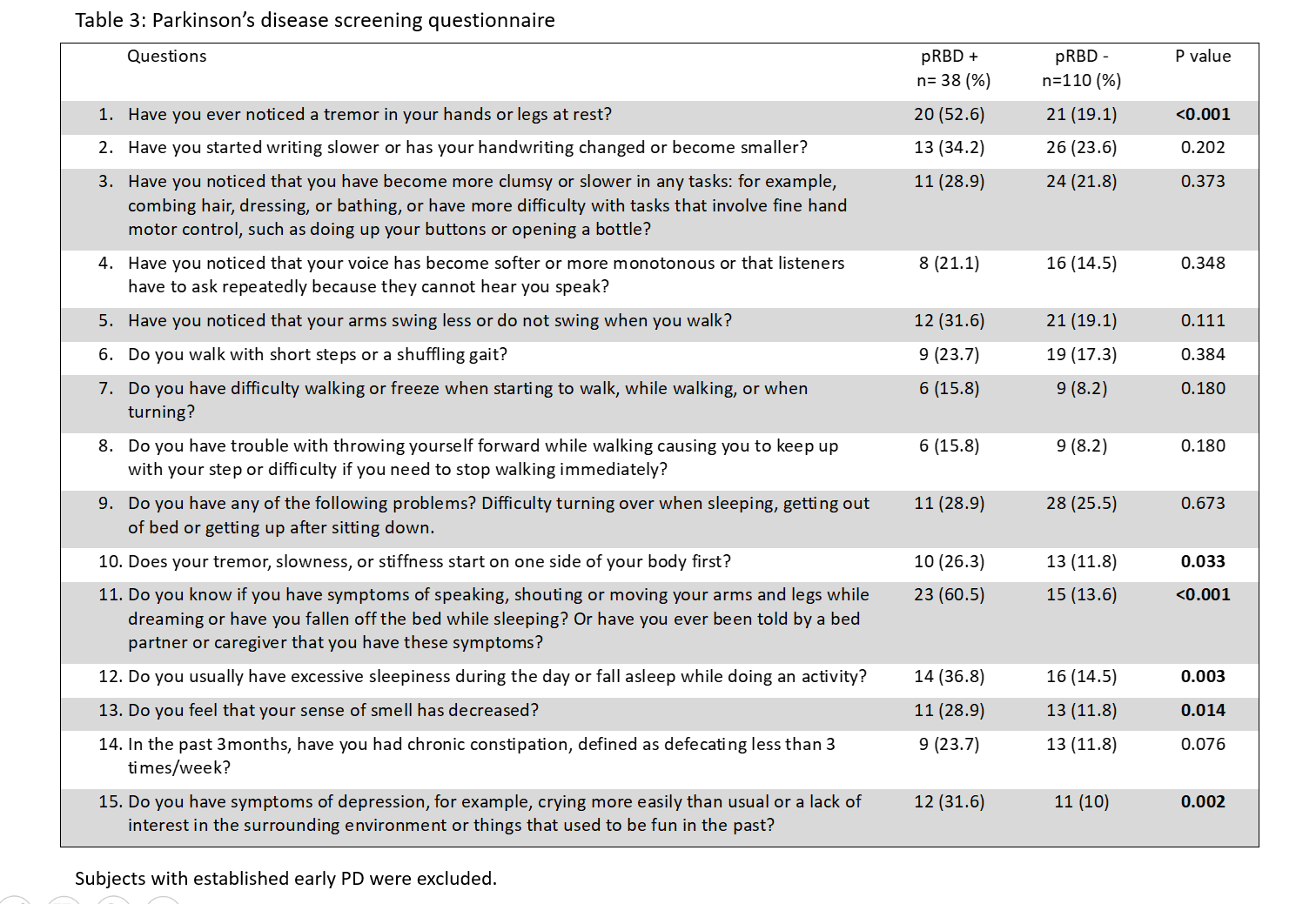 MDS Abstracts - https://www.mdsabstracts.org/abstract/clinical-characteristics-and-motor-dysfunction-in-probable-rem-sleep-behavior-disorderprbd-insights-from-check-pd-community-based-screening-project/