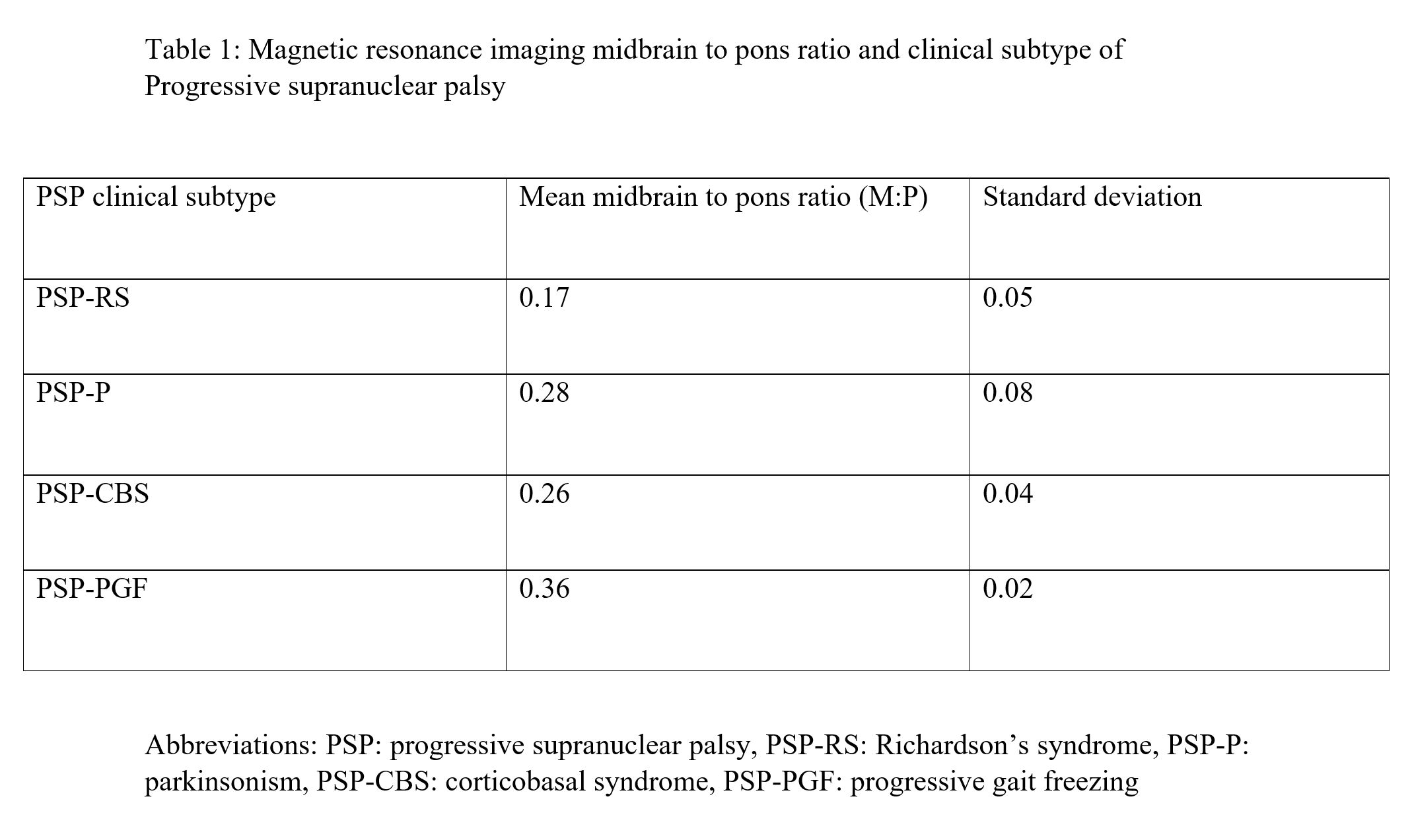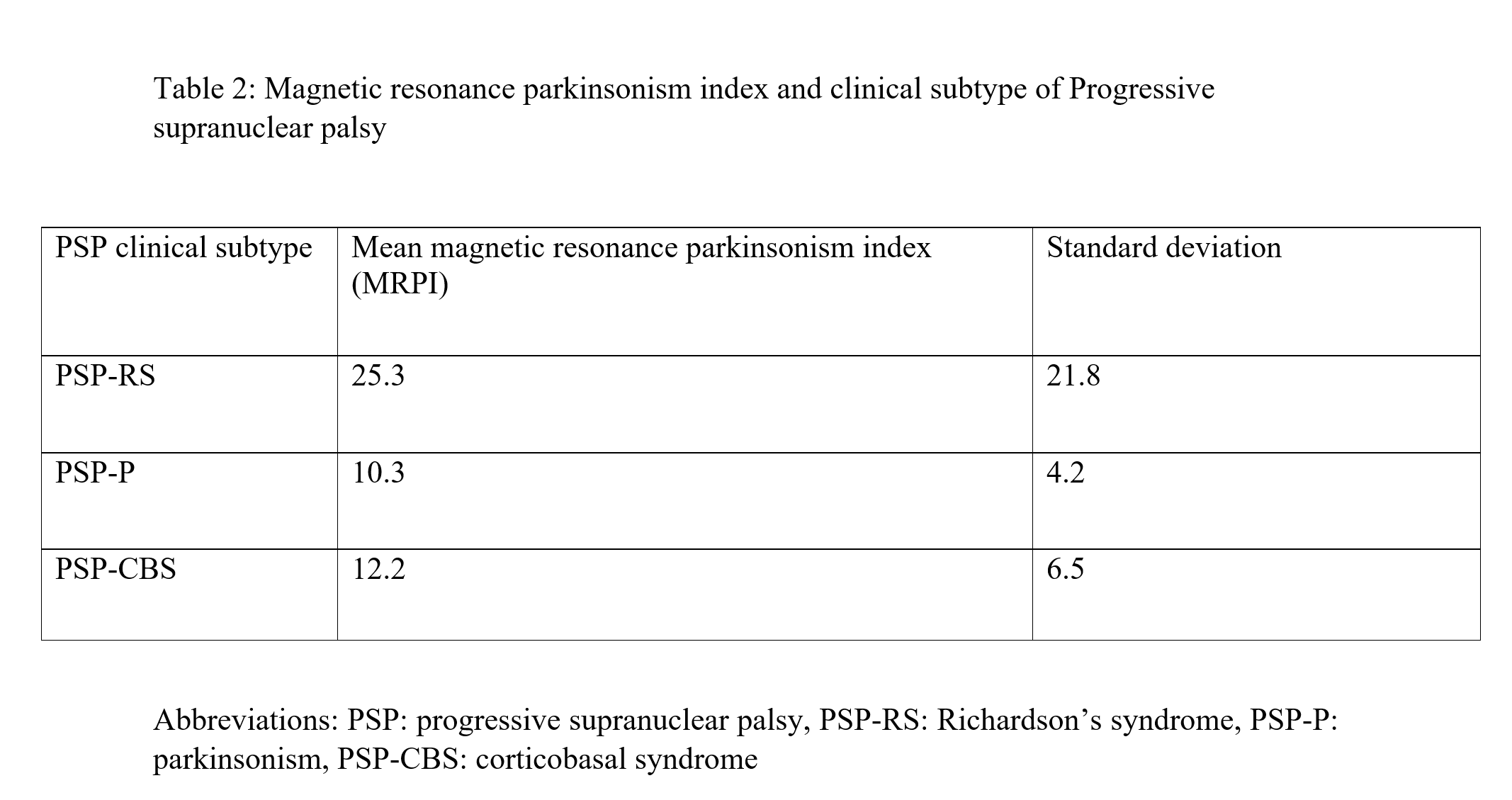 MDS Abstracts - https://www.mdsabstracts.org/abstract/clinical-subtypes-and-radiological-patterns-in-progressive-supranuclear-palsy-a-prospective-study/