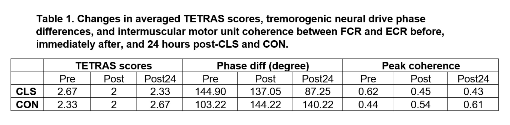 Results: TETRAS scores indicated that CLS resulted in the greater reduction in tremor severity immediately after stimulation. Tremor intensity increased at 24 hours but remained lower than pre-stimulation levels (Fig 2). A total of 123 motor units were analyzed. Following CLS, peak intermuscular coherence in the tremor band decreased, whereas it increased after CON (Table 1). Up to 24 hours post-intervention, CLS shifted the phase difference of tremorogenic neural drives toward an in-phase pattern, similar to that previously observed in ET patients at rest. [3] In contrast, CON resulted in out-of-phase neural drives, a pattern typically seen in ET patients during postural tasks.[3]
