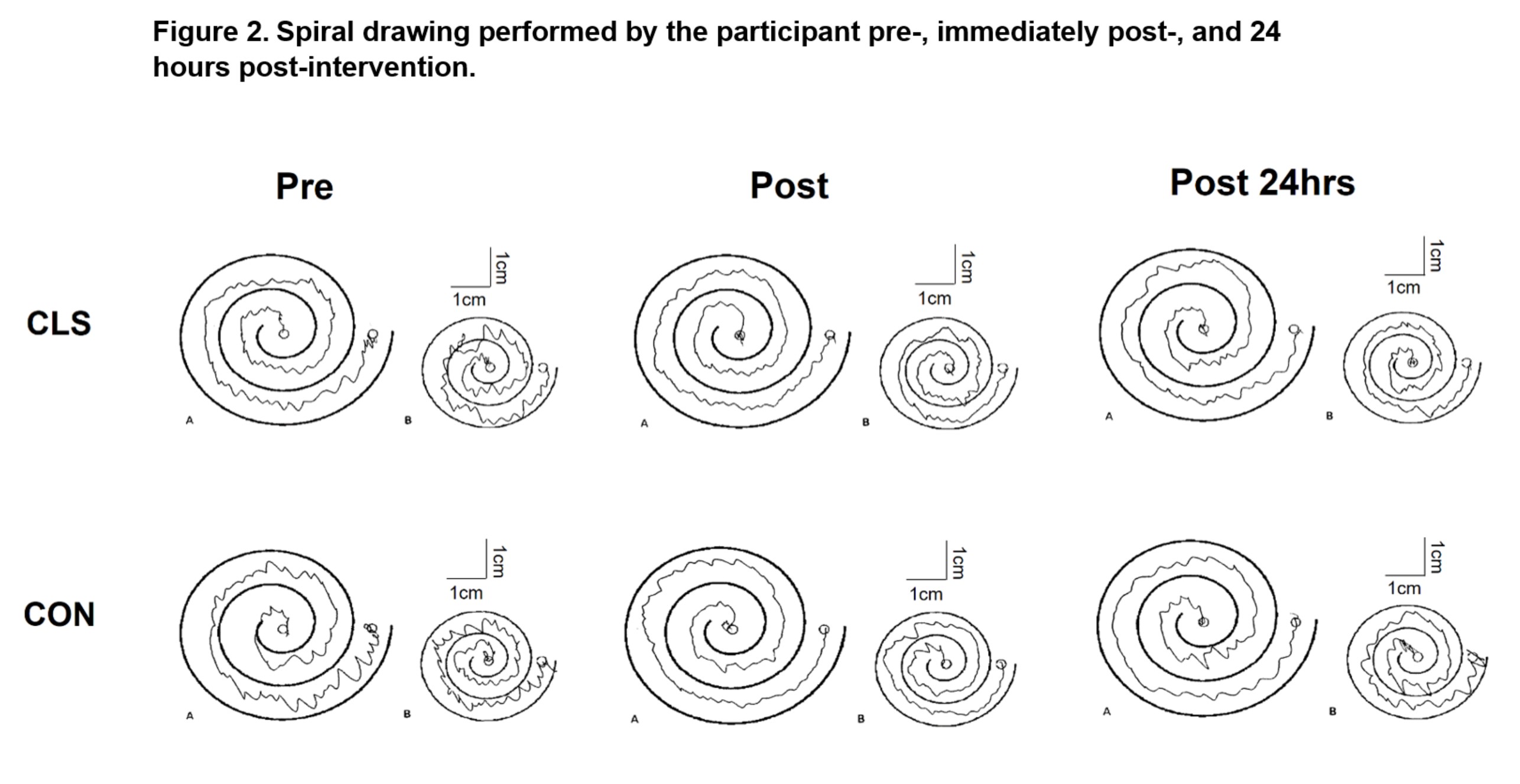 Method: A 78-year-old male with ET underwent CLS and control (CON, no stimulation) interventions, with a three-week washout between sessions. CLS was delivered transcutaneously at the wrist for 40 minutes. Pre-, post-, and 24 hours post-intervention, the participant completed spiral drawing and handwriting tasks, with tremor severity assessed by a blinded movement disorder specialist using TETRAS.[2] High-density EMG was also recorded from the flexor carpi radialis (FCR) and extensor carpi radialis (ECR) of the tremorogenic arm during two postural tasks (arms extended forward and flexed close to the chest) to extract motor unit firing patterns. Cumulative spike trains (CSTs) of FCR and ECR motor units were computed to estimate neural drives. Intermuscular coherence in the tremor band (4–12 Hz) and phase differences between tremorogenic neural drives were analyzed using CSTs.