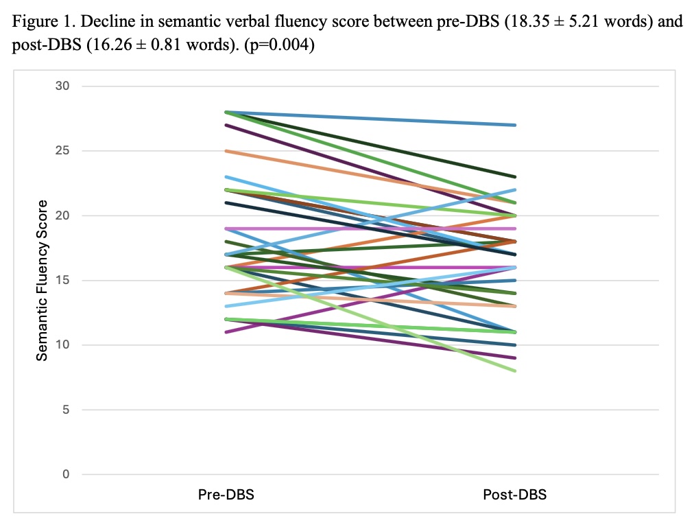 Results: 31 patients met inclusion criteria, with an average age of 67.8 ± 7.7 yrs. Demographics and details of the surgical approach are shown in Table 1. Of 24 compared cognitive measures, only semantic verbal fluency showed statistically significant change after DBS (pre-DBS 18.35 ± 5.21 vs. post-DBS 16.26 ± 0.81; p=0.004) [Figure 1]. There was a trend towards declined semantic fluency with bilateral procedures as compared to a unilateral or staged approach, not reaching statistical significance. Number and duration of surgeries, time between cognitive testing, number and doses of anesthetic medications used, and ACB had no significant effect on change in semantic fluency.