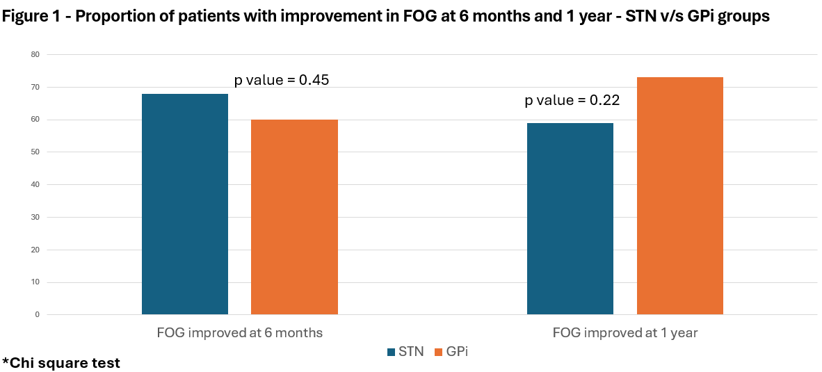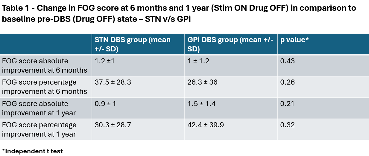 Results: 22 patients in STN group and 20 patients in GPi group had levodopa responsive FOG before DBS. Mean age at DBS was 60.23 ± 8.54 years in STN group and 64.05 ± 4.78 years in GPi group. Pre-op FOG severity in drug OFF was similar in both groups (p = 0.781). Mean improvement in FOG scores at 6 months and 1 year are shown in table 1. At 6 months post-DBS, 68.2% in STN group and 60% in GPi group had improvement in FOG (p = 0.58). Among the patients with improvement in FOG at 6 months, 66.7% in STN group and 80% in GPi group had sustained benefit at 1 year (p = 0.11). Univariate analysis showed no significant differences in age, sex, disease duration, disease phenotype, pre-DBS levodopa response, DBS target, MoCA, FAB, BDI scores between patients with and without improvement in FOG after DBS.