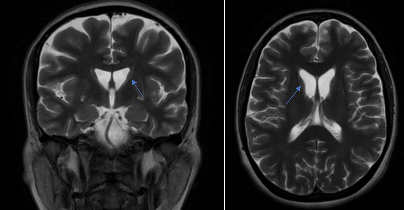 Results: A 34-year-old female, with healthy non-consanguineous parents, presented an obsessive-compulsive disorder for 5 years, 2 years later she presented spasmophemia, vocalizations and frequent lip biting with self-mutilation. Neurological examination revealed dysarthria, orolingual dyskinesia, mild generalized chorea and unsteady gait. Cognitive evaluation reported diminished attentional and executive functions. Laboratory showed presence of acanthocytes in peripheral blood film and CK levels >1000 U/L. EMG and echocardiogram were normal. MRI showed bilateral caudate atrophy (figure 1). HTT testing and copper levels were normal. NGS panel reported two heterozygous variants in VPS13A a deletion (Exons 51-59) classified as likely pathogenic, and c.5157C>T; p.Gly1719 = classified previously as variant of uncertain significance (VUS), but recently reclassified as likely pathogenic (4). Parents testing demonstrated that variants were in trans and the two unaffected siblings carried no variants.