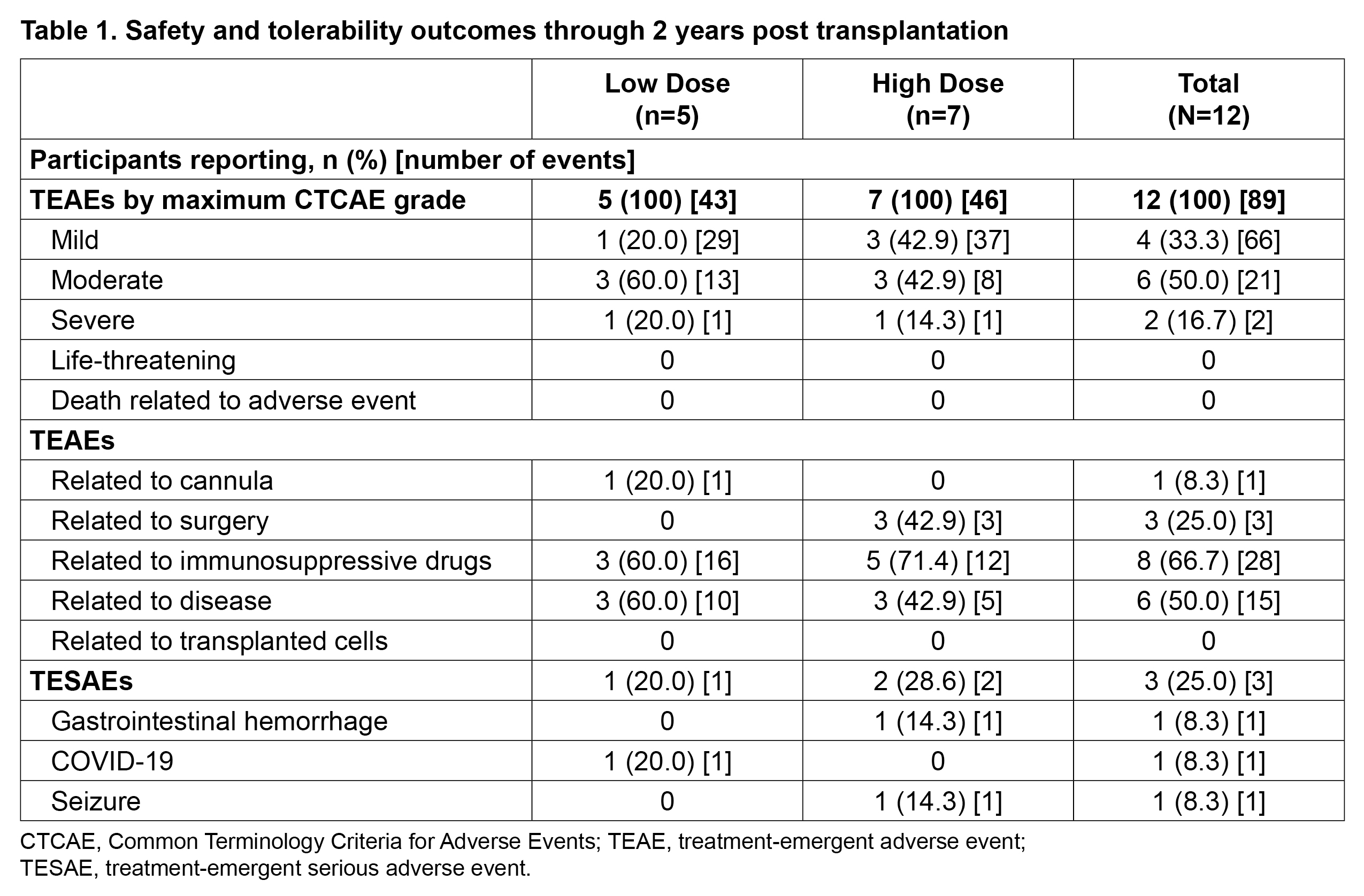 Conclusion: Bemdaneprocel demonstrated a favorable safety profile and trended toward improvement or stability across clinical assessments through 2 years post transplantation. Results to date support the ongoing development of bemdaneprocel for the treatment of PD.