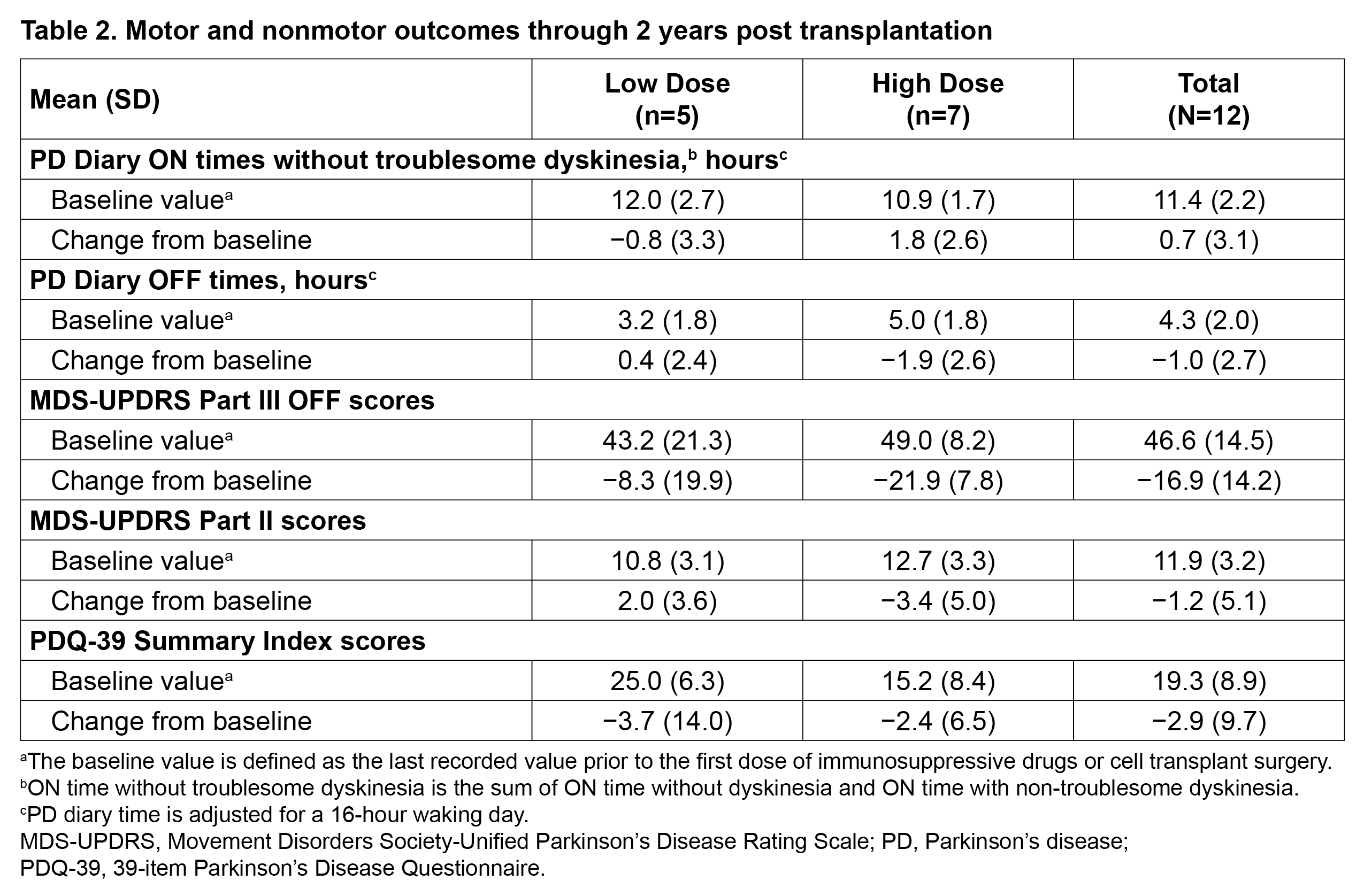 Results: Participants (N=12) were a median of 67.0 years of age, 75% male, and 67% White. Median time since PD diagnosis was 9.0 years. Through 2 years post transplantation, 12 participants experienced 89 treatment-emergent adverse events, mostly mild or moderate in severity [table 1]. Three treatment-emergent serious adverse events, all unrelated to bemdaneprocel, were reported: COVID-19 (low dose), gastrointestinal hemorrhage (high dose), and seizure (high dose) possibly related to surgery. There were no deaths or graft-induced dyskinesias. No intracerebral hemorrhages or mass lesions were observed by magnetic resonance imaging. In the high-dose cohort at 2 years post transplantation, mean (SD) changes from baseline in patient-reported ON times without troublesome dyskinesia (+1.8 hours [2.6]) and OFF times (−1.9 hours [2.6]) and MDS-UPDRS Part III OFF scores (−21.9 points [7.8]) showed a continuing trend toward improvement [table 2]; non-motor assessments were stable. Outcomes in the low-dose cohort were stable. Results through 3 years post transplantation will be presented.